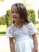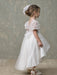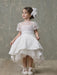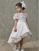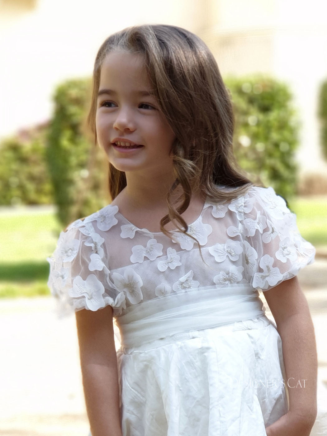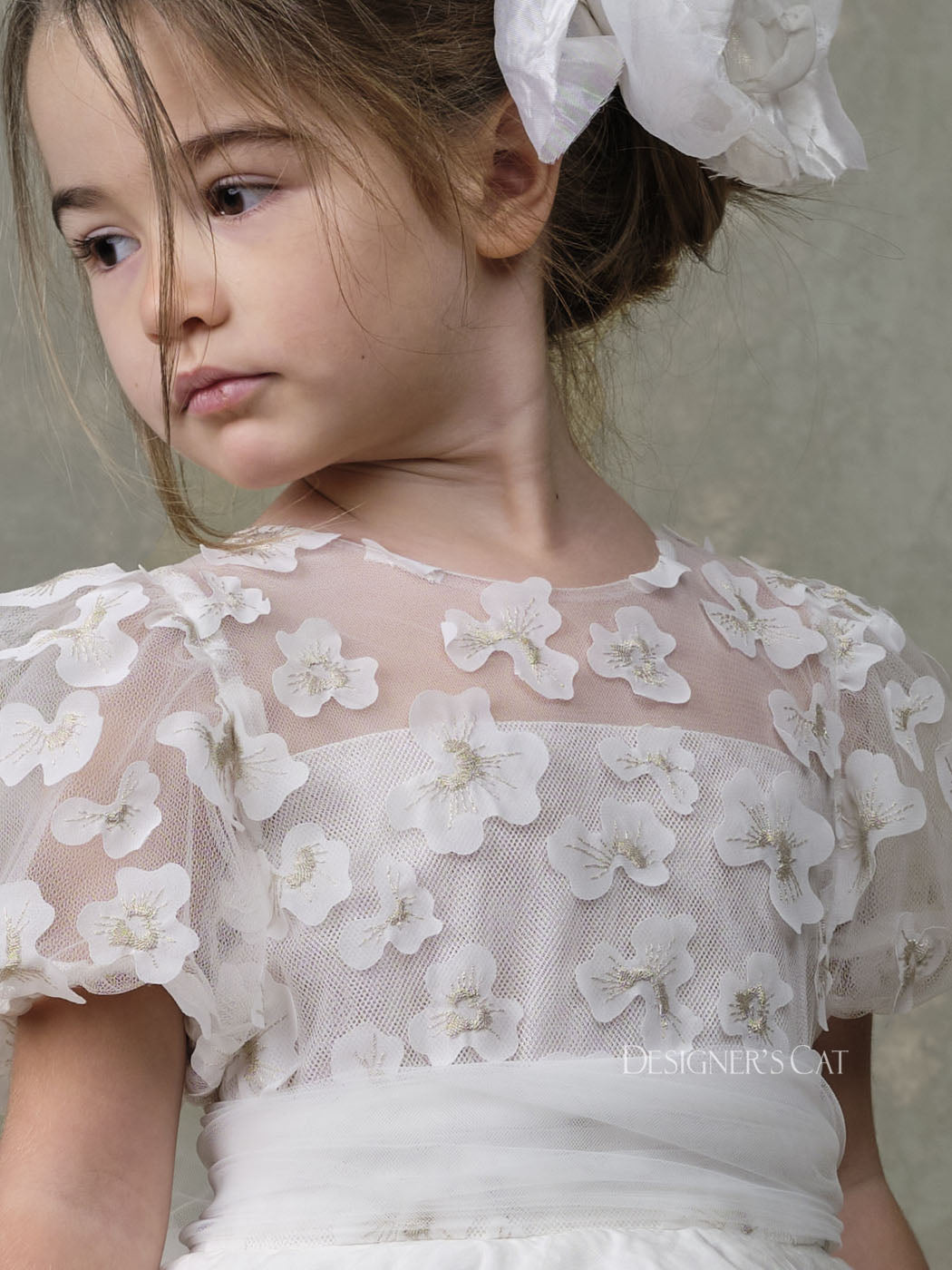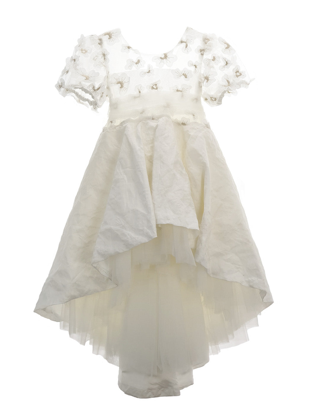An elegant asymmetric dress with sleeve, made of excellent silk fabric and fine tulle decorated with lovely appliqué 3D motifs. Impressive outfit for special occasions. Inner lining is 100% cotton. Erofili dress can be combined with matching hair accessories and shoes from the "Designer’s Cat Shoes" collection. Available sizes: 1 to 12years old. Color: ivory