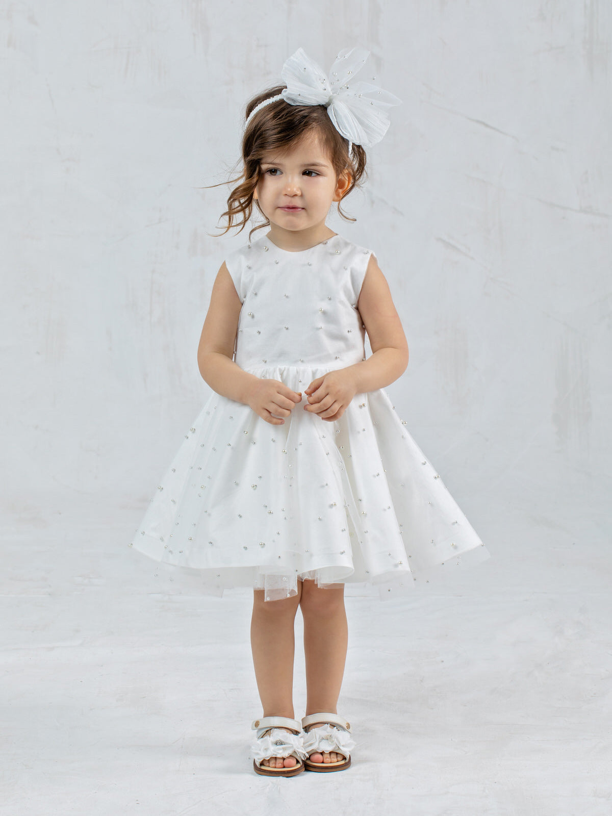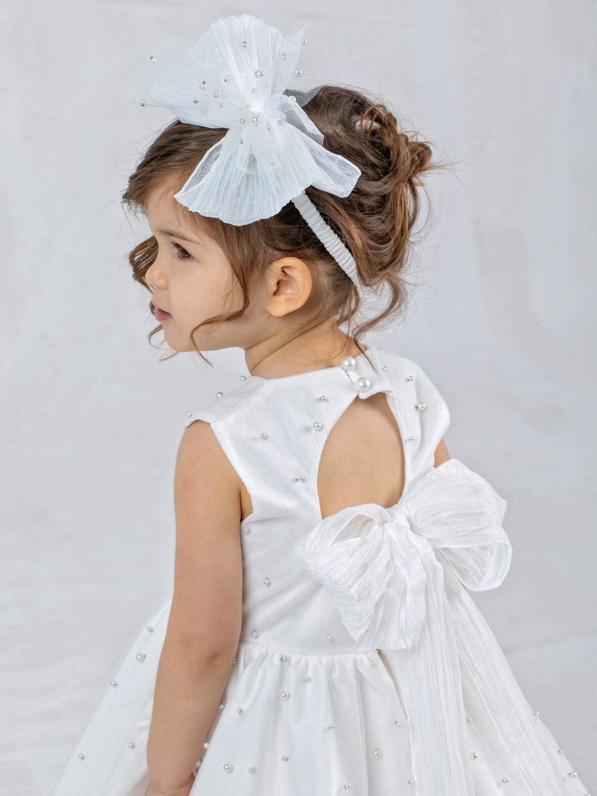Designer's Cat - A romantic backless dress made of silk blend, sleeveless with round neck, decorated with pearls on tulle. Lovely pleated maxi bow at the back and skirt with ruffles. Inner lining is 100% cotton. An excellent choice for the day of baptism and also for special events.