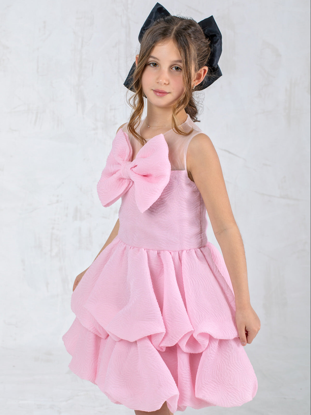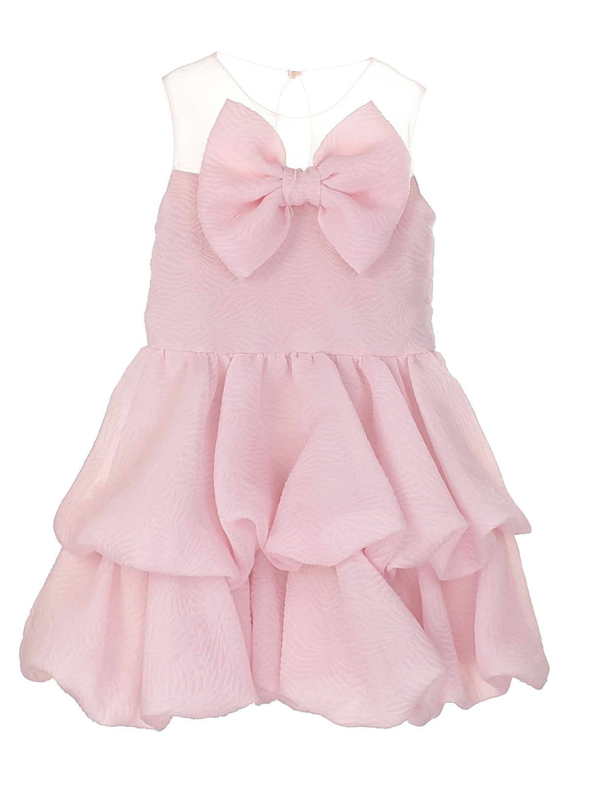 Designer's Cat - Trendy sleeveless dress in balloon line, made of amazing embossed fabric with 3D effect, decorated with a maxi bow to the chest, and tulle at the top. Inner lining is 100% cotton. A beautiful dress for special occasions.