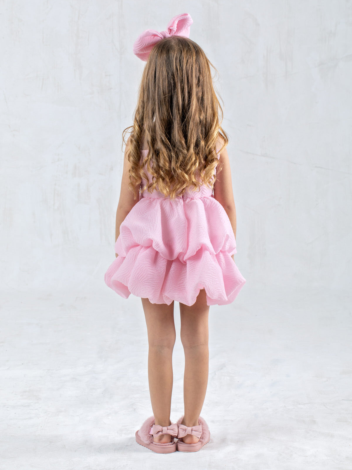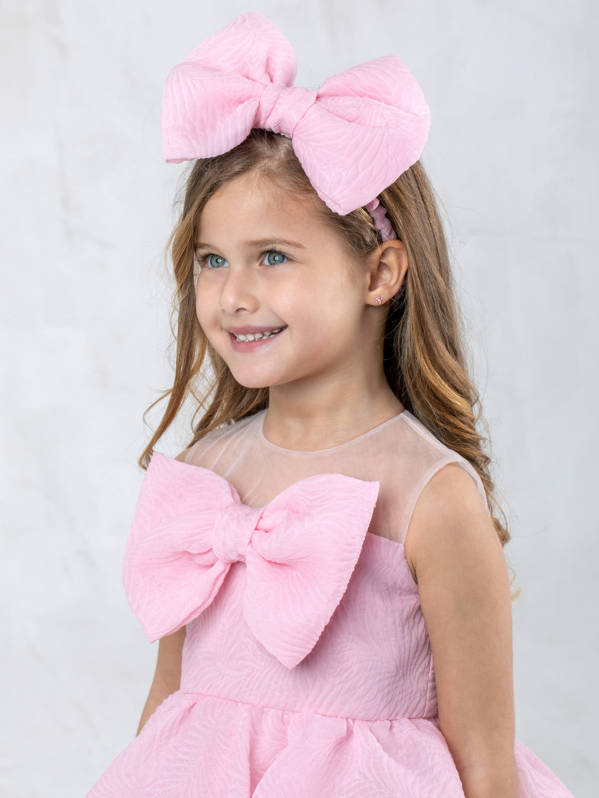 Designer's Cat - Trendy sleeveless dress in balloon line, made of amazing embossed fabric with 3D effect, decorated with a maxi bow to the chest, and tulle at the top. Inner lining is 100% cotton. A beautiful dress for special occasions.