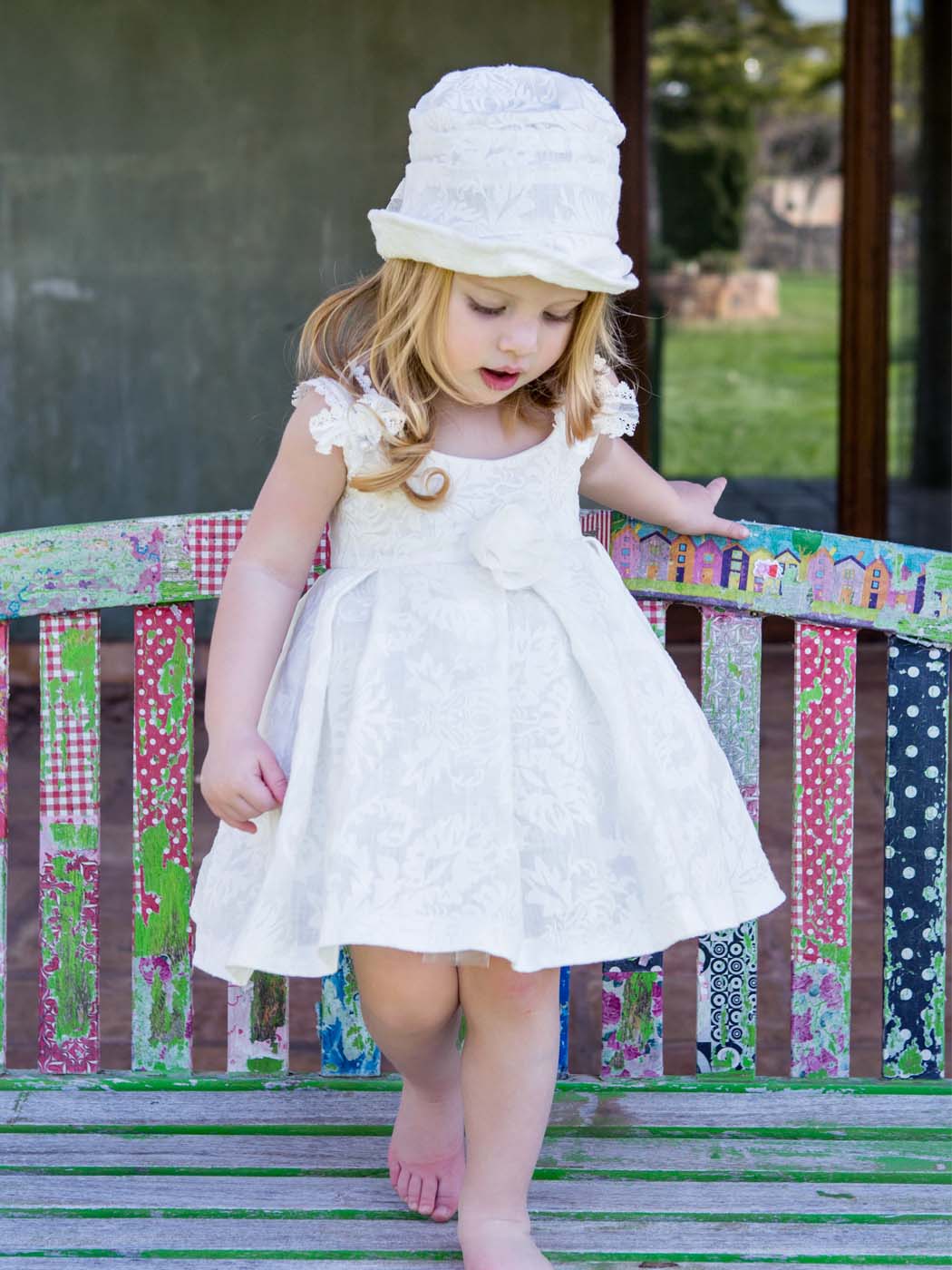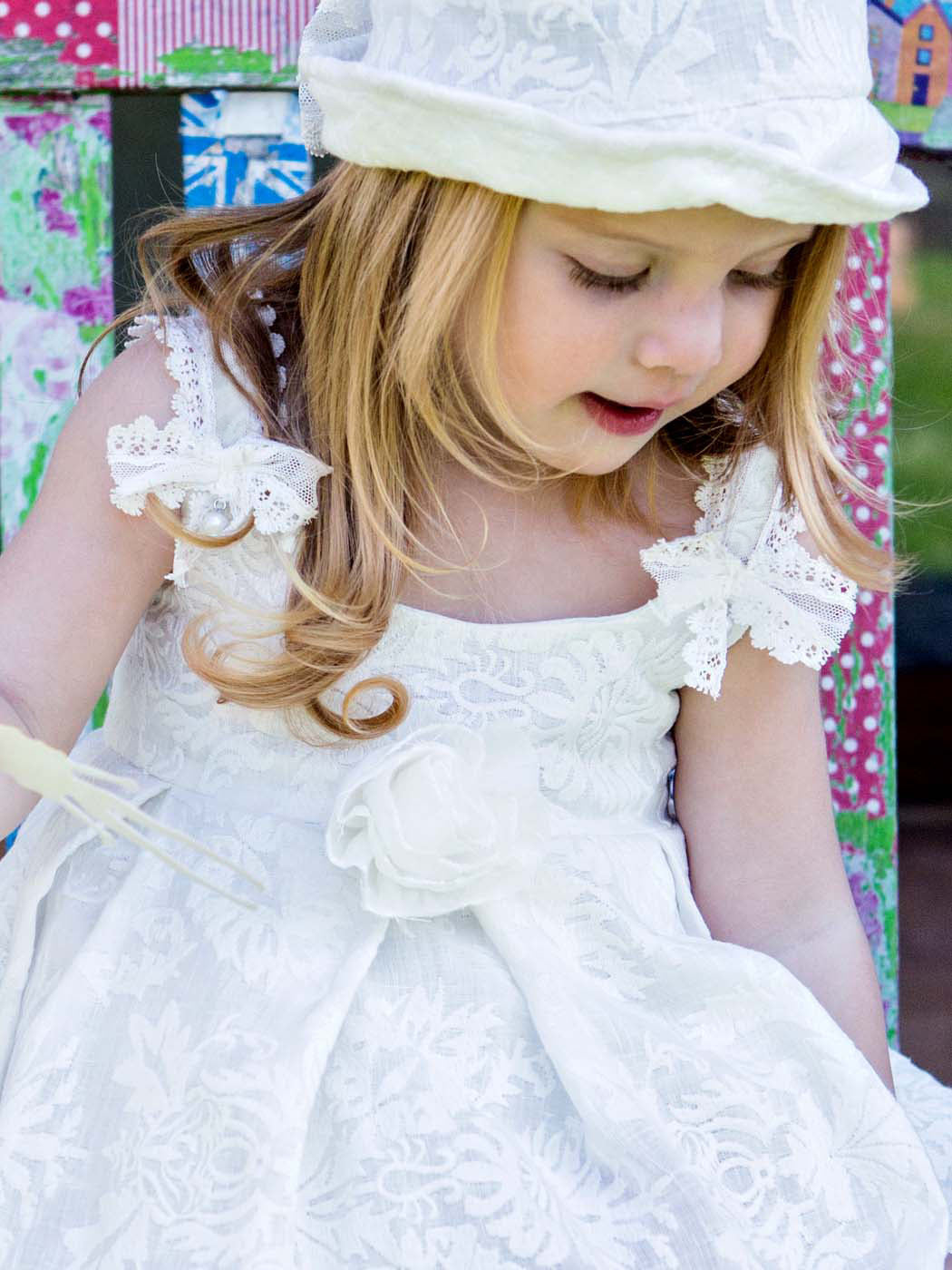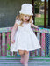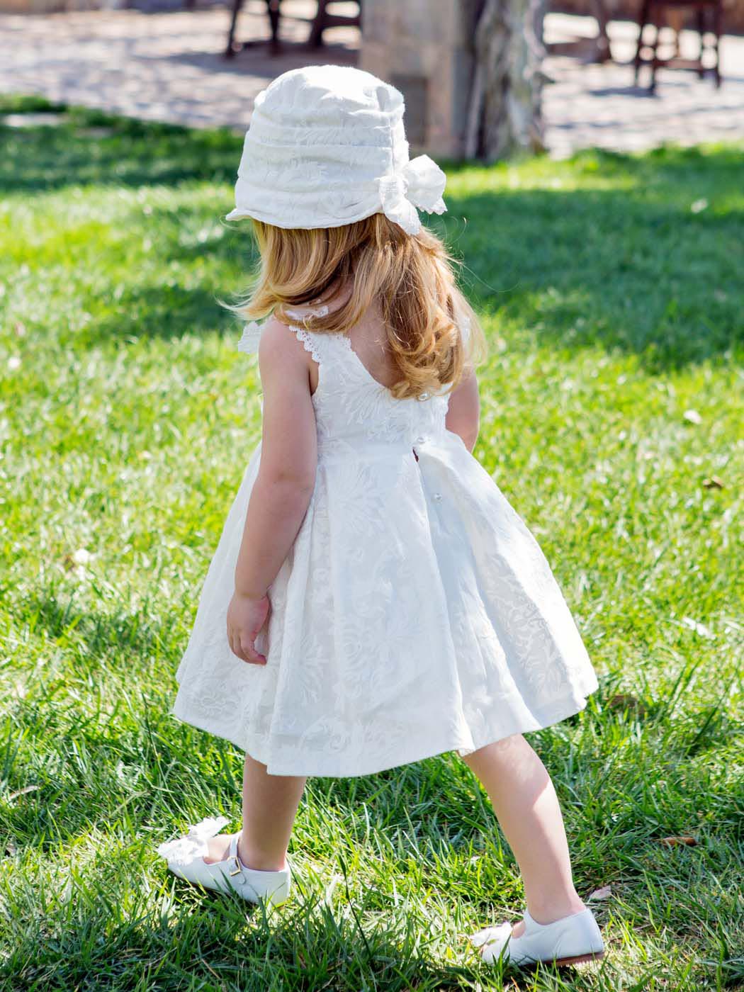 A special dress made of beautiful embroidery linen fabric, decorated with refined French trimming. Inner lining is 100% cotton. Marilu dress is an impressive suggestion for the summertime and special events. It can be combined with matching bolero, headband and shoes from the "Designer’s Cat Shoes".