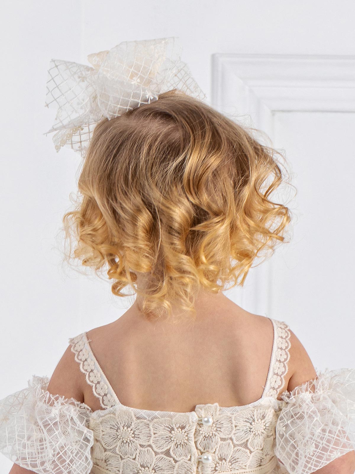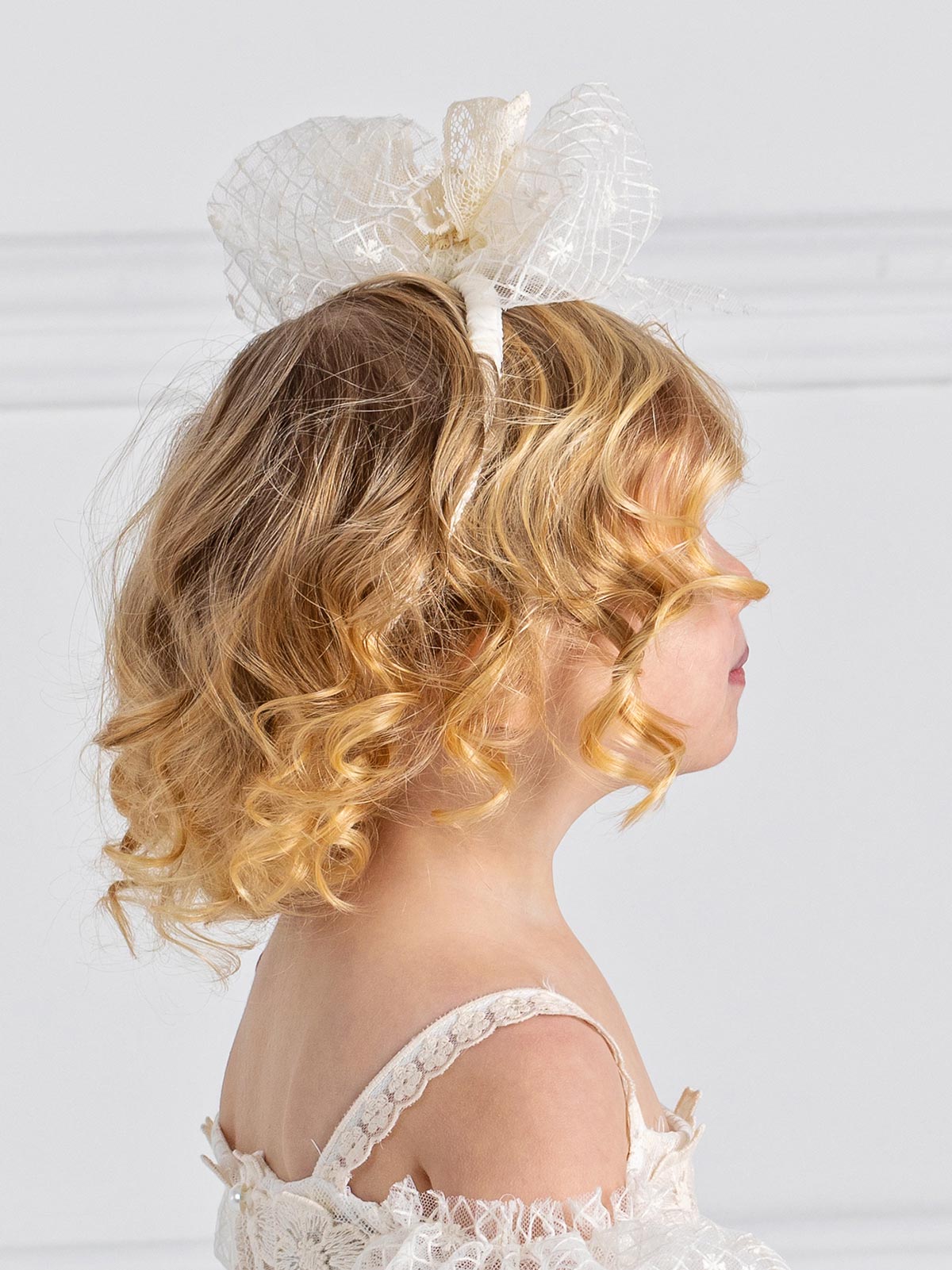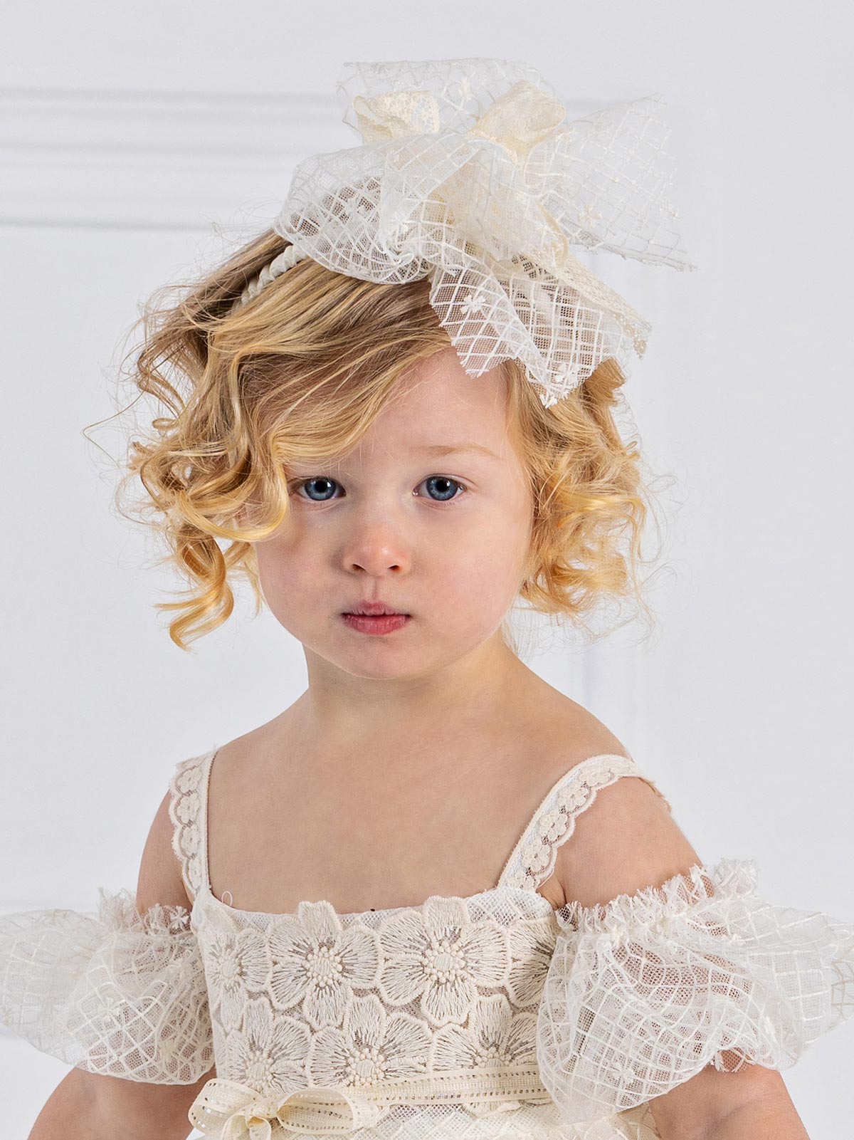 Headband made of tulle and veil, decorated with cotton lace and embroidered soft tulle. It can be combined with the matching dress from the Designer's Cat collection. The hair ribbon is corresponding to ages from 6 months to 10 years old.