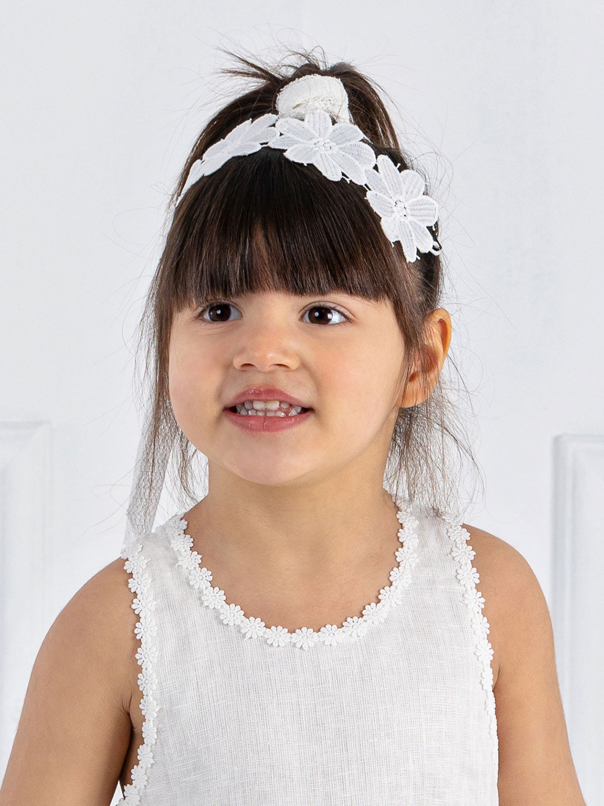 Elegant headband for girl made of Kippur lace and tying with tulle ribbons. It can be combined with the matching dress from the Designer's Cat collection. The hair ribbon is corresponding to ages from 6 months to 10 years old.