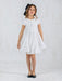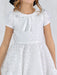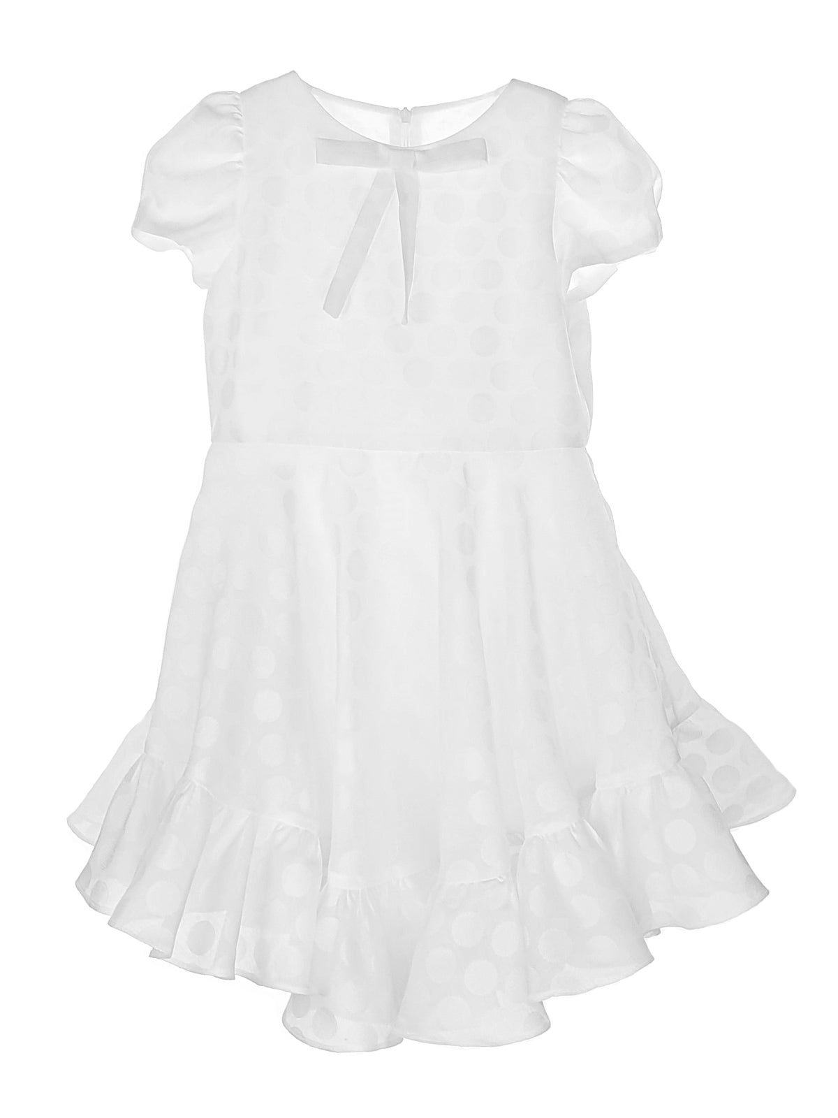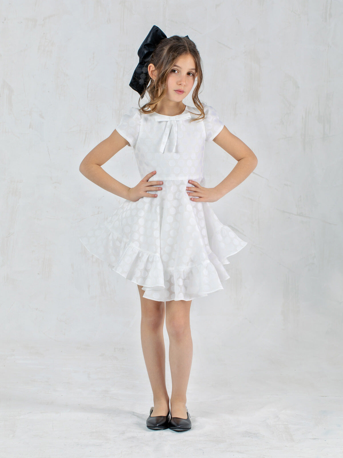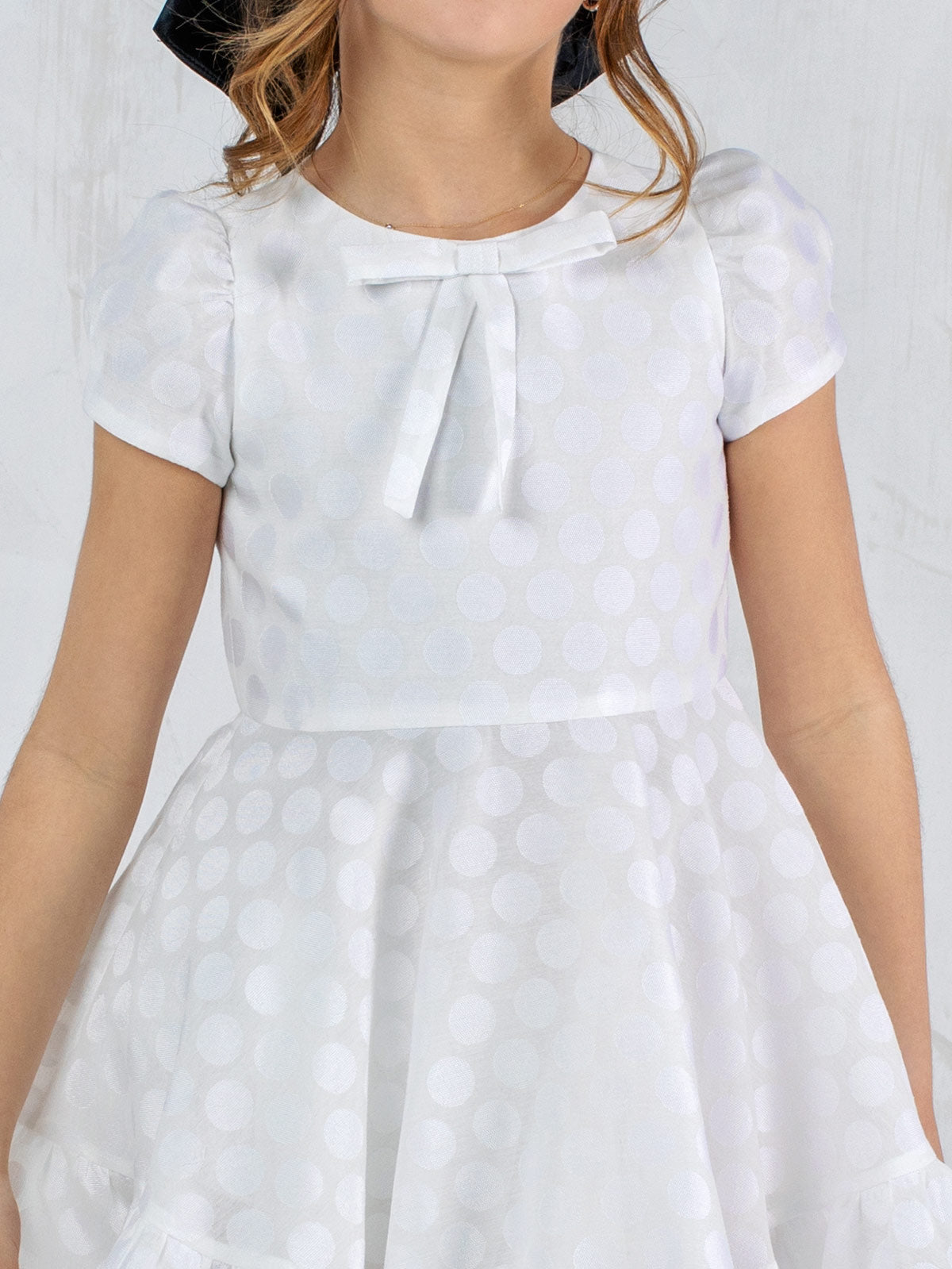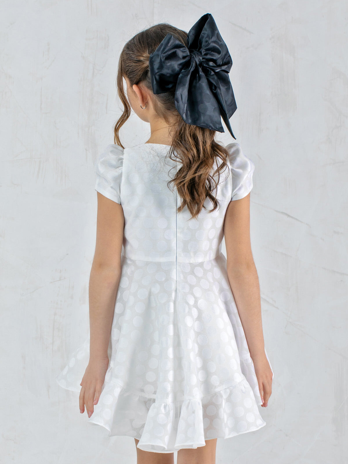 'Designers Cat"- Elegant and modern dress at the same time, made of an excellent jacquard cotton blend fabric with large polka dots, round neckline, short sleeves decorated with a lovely bow on the chest and ruffles on the skirt. Back zipper closure. A perfect idea for a special occasion.