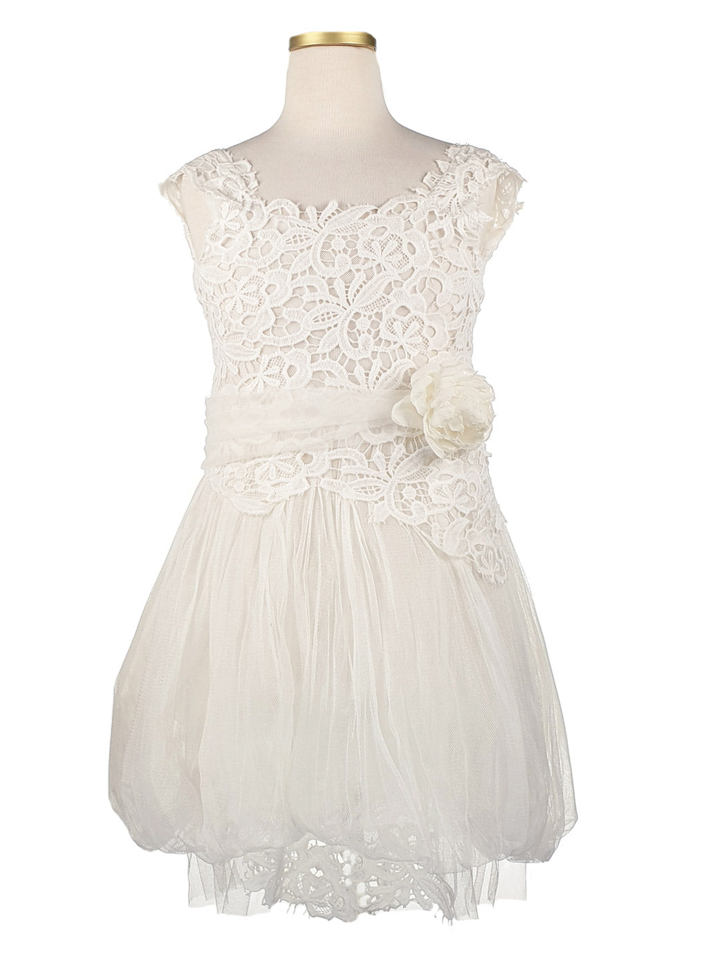 Balloon asymmetric tail dress from fine cotton tulle of high design. Bust, sleeves and tail are embroidered with french guipure lace. It is decorated with a light pink (vintage) handmade flower. Inner lining is 100% cotton. SANDRA dress can be combined with matching bolero and shoes from the "Designer’s Cat shoes" collection.
