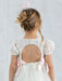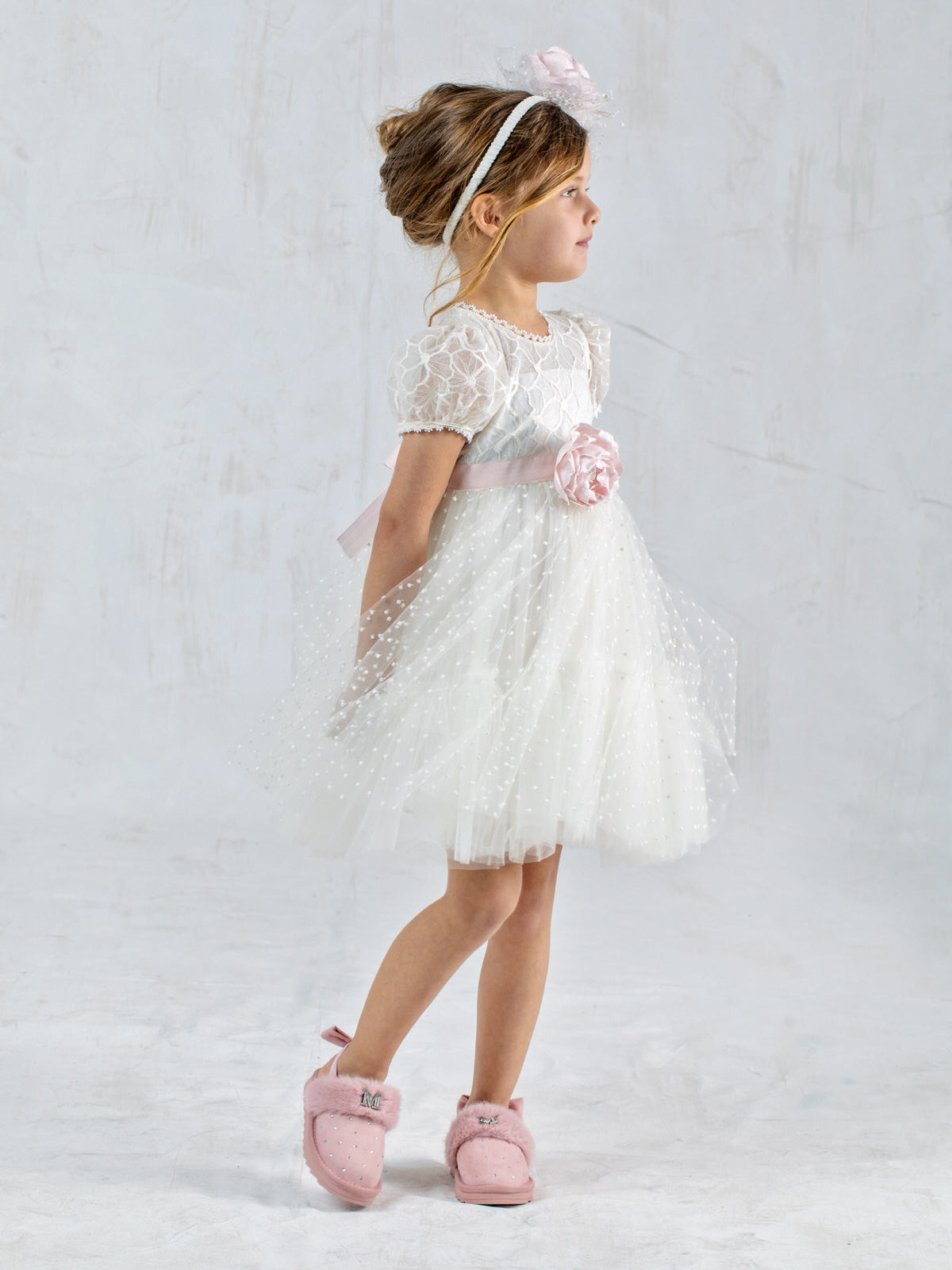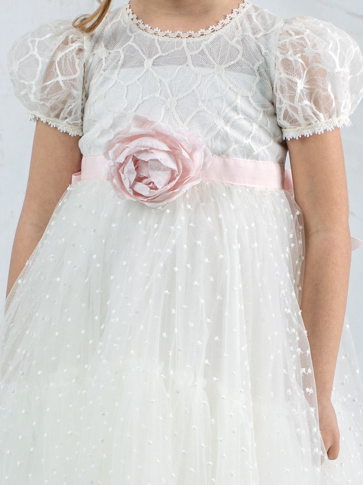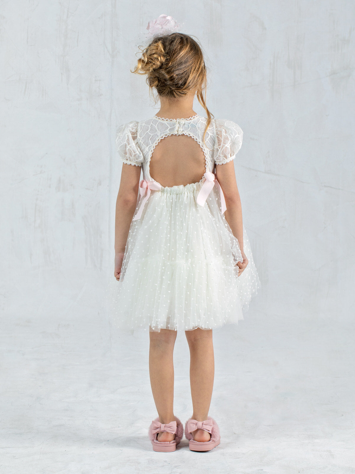 Designer's Cat – Romantic backless dress, with gorgeous puff sleeve, round neck, embroidered tulle dots and French lace. It is decorated with handmade linen flower. Inner lining is 100% cotton. A dress of exceptional aesthetics for special occasions.