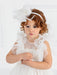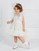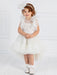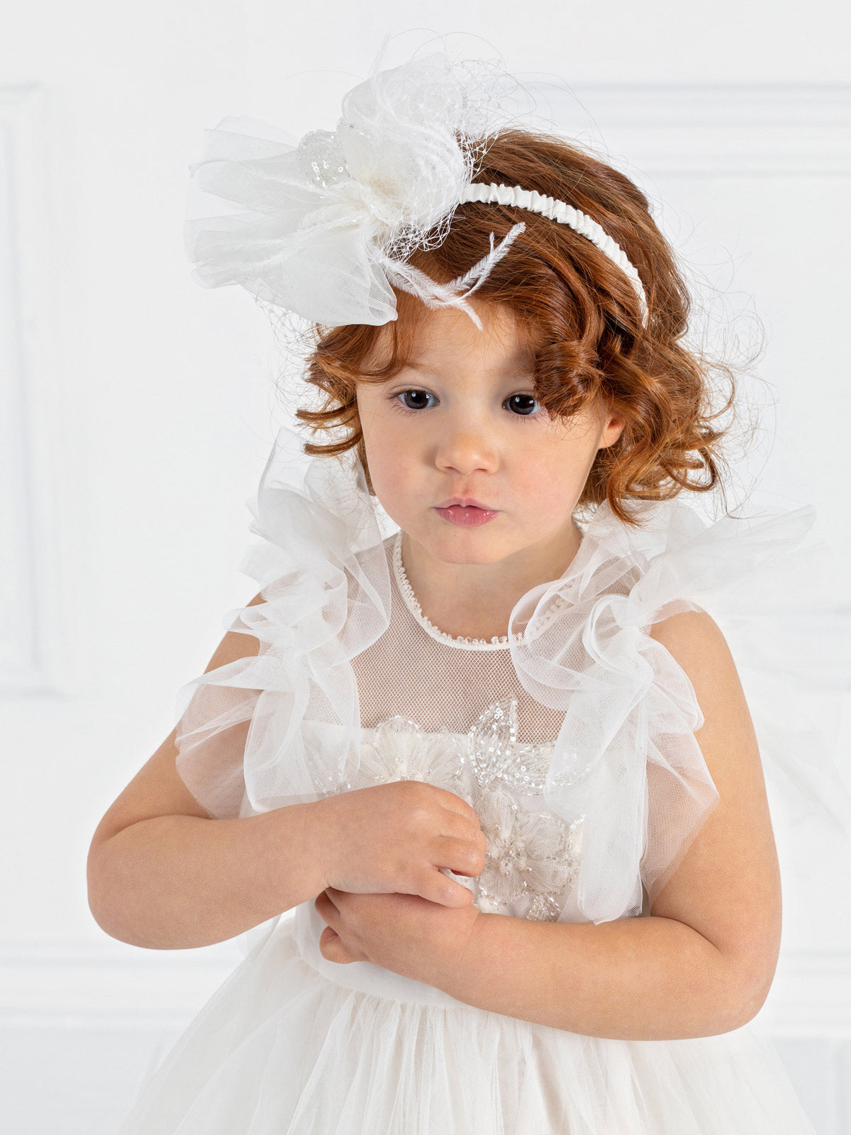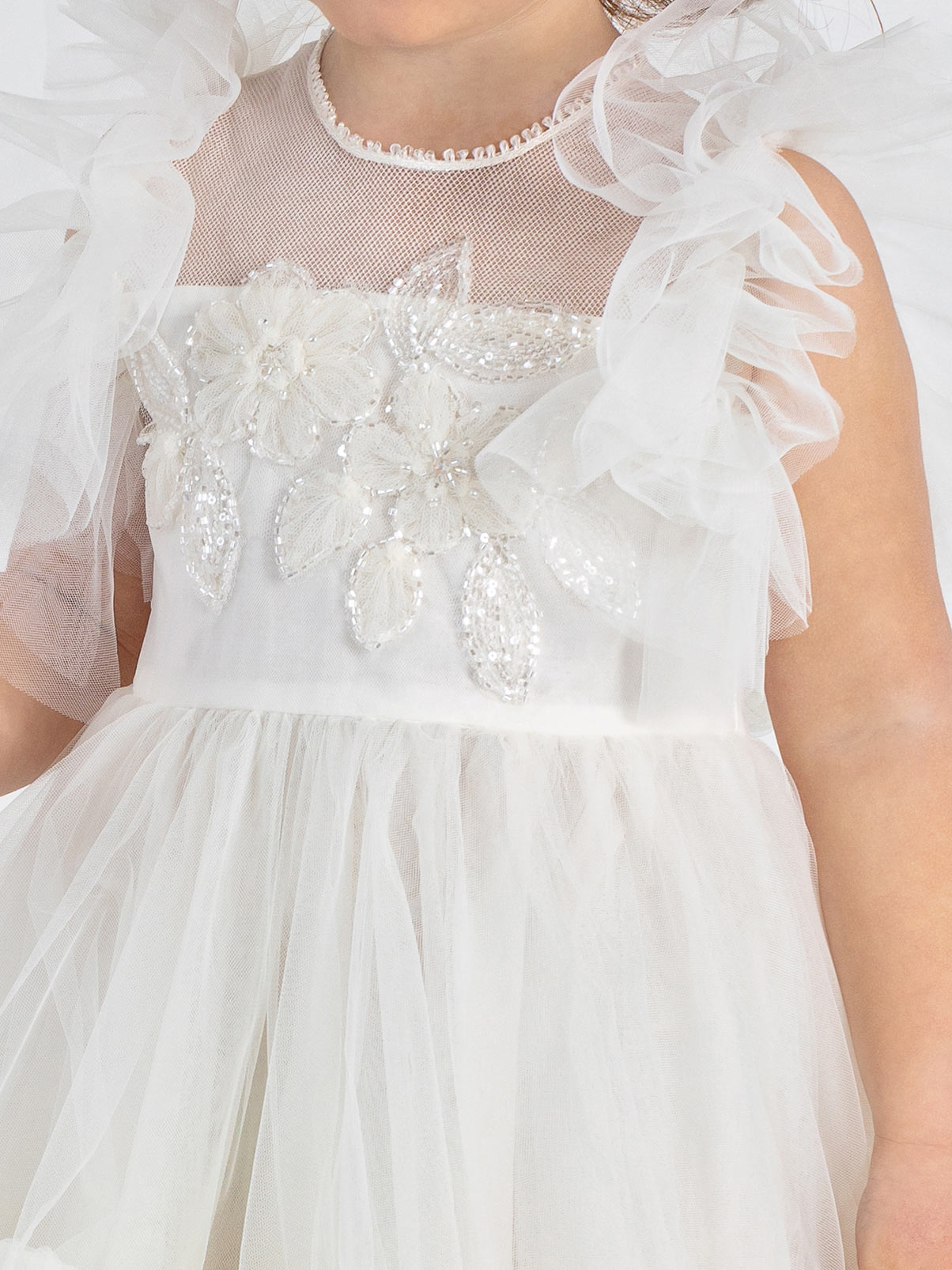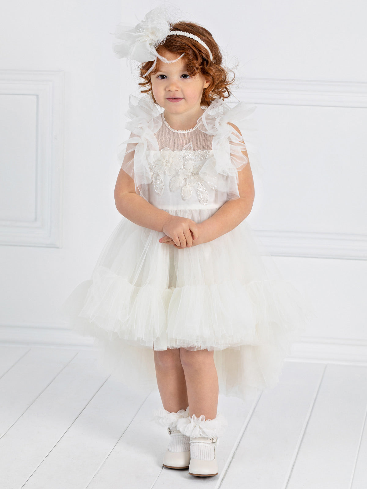 An asymmetric tulle dress, with lovely short ruffled sleeves, decorated with embroidered patterns and iridescent sequins on the chest. High waisted dress, round neckline, and skirt with multi-layer tulle. It is a proposal with a romantic mood for every special event as the baptism.