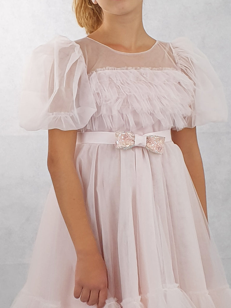 Romantic dress in dusty pink color, made of Silk-touch tulle, with lovely Gigot sleeve, ruffles on the bust and the end of the skirt. It is decorated with a beautiful satin belt with beaded bow. Inner lining is 100% cotton. A stylish dress for special occasions.