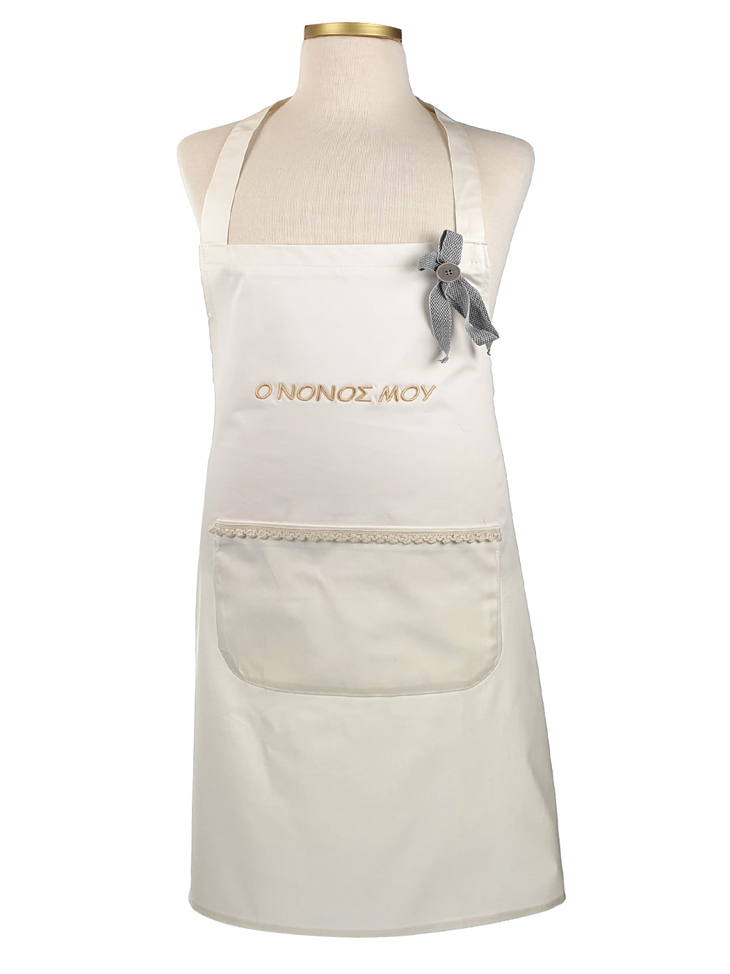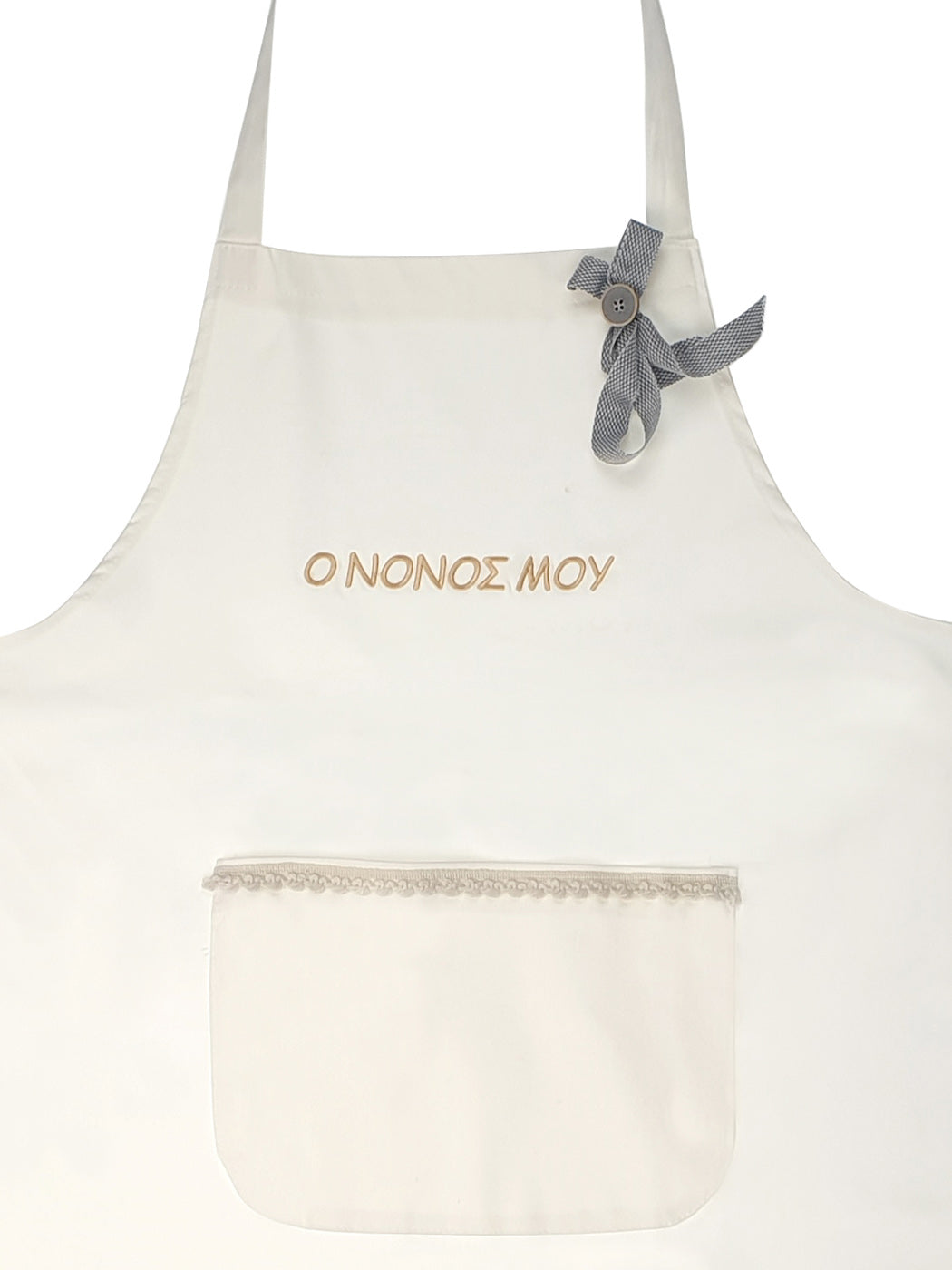 Cotton godfather baptism apron with embroidery. It is decorated with bow and materials from the matching christening outfit. The apron has two straps that tie at the back and one for the neck.