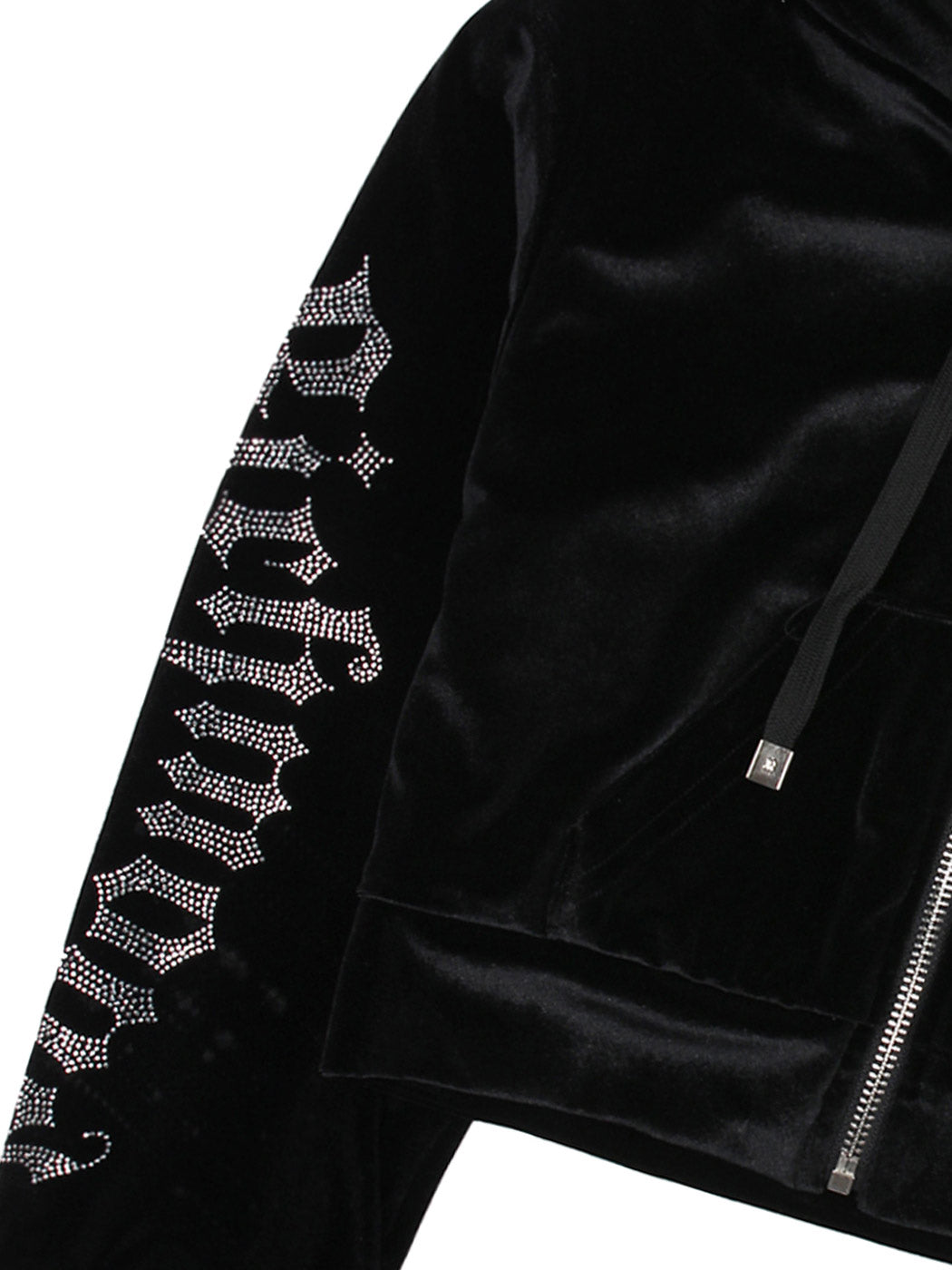 Fashionable velour sweatshirt with hood for girl, decorated with Impressive logo- JR. This can be combined great with matching velvet pants.