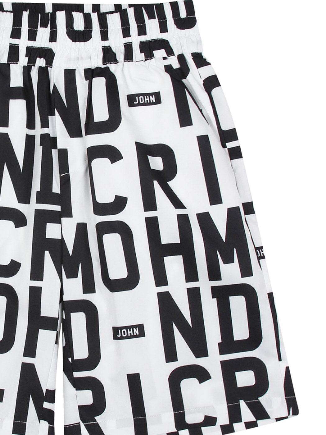 John Richmond swim shorts with large logo prints all over The swim shorts are adjustable in the waist, and also have a wide elastic in the wait for a nice fit.
