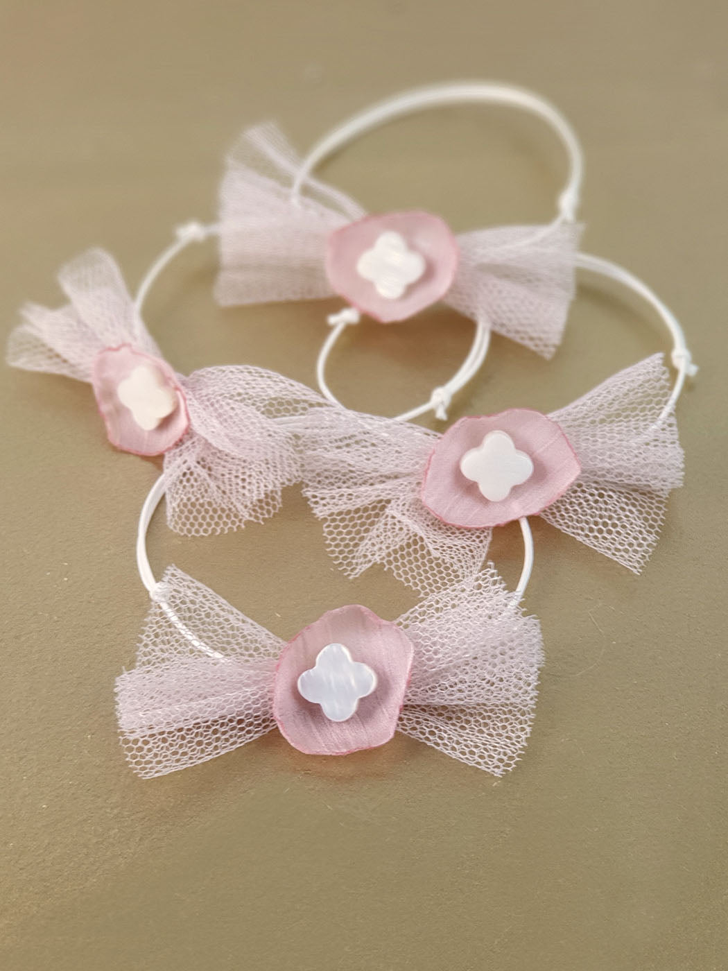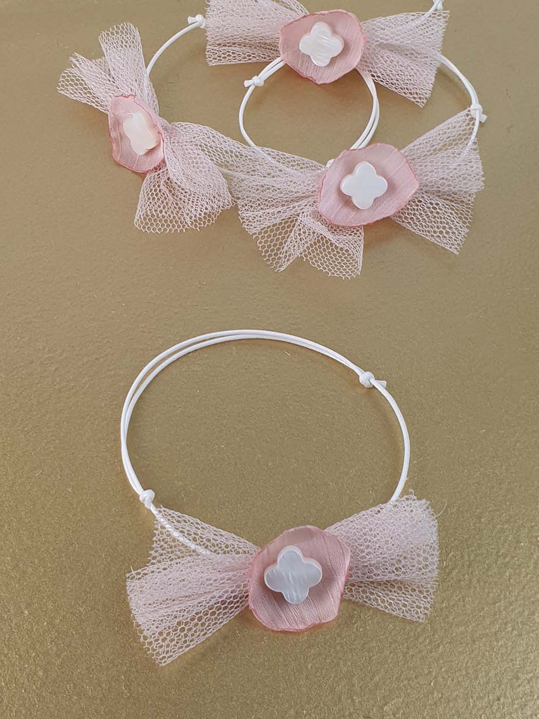 Handmade testimonial (Martyriko) bracelet DESIGNER'S CAT,with cross made of shell , decorated with a lovely pink tulle bow and flower.
