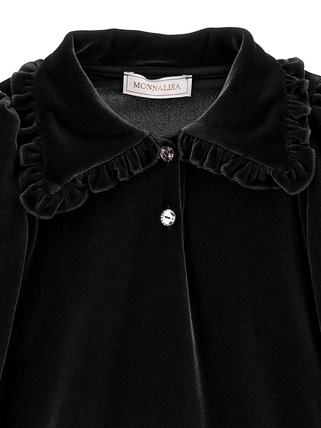 Elegant low-waisted chenille dress with wide collar with ruffles and polo fastening with jewel buttons. They provide comfort and flexibility in every occasion and with the right accessories, compose a complete look.