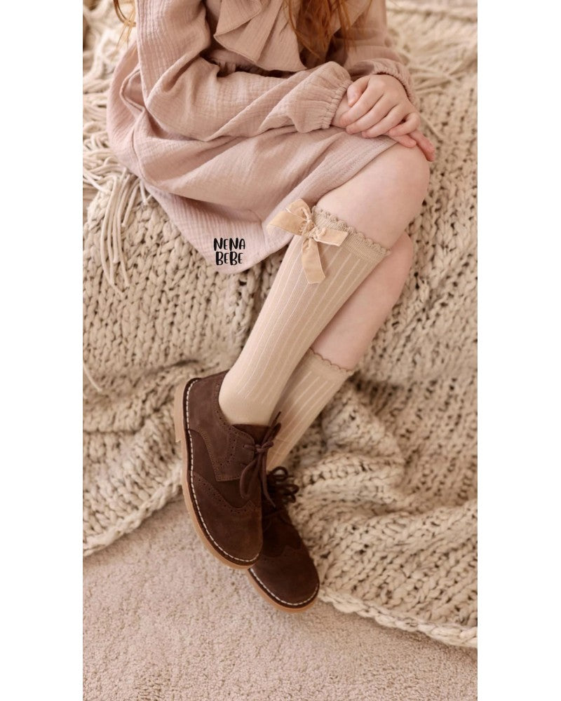 Ribbed knee-high socks in the colors of white, gray, black, ecru, beige and pink. They are decorated with a lovely handmade bow in the same color.