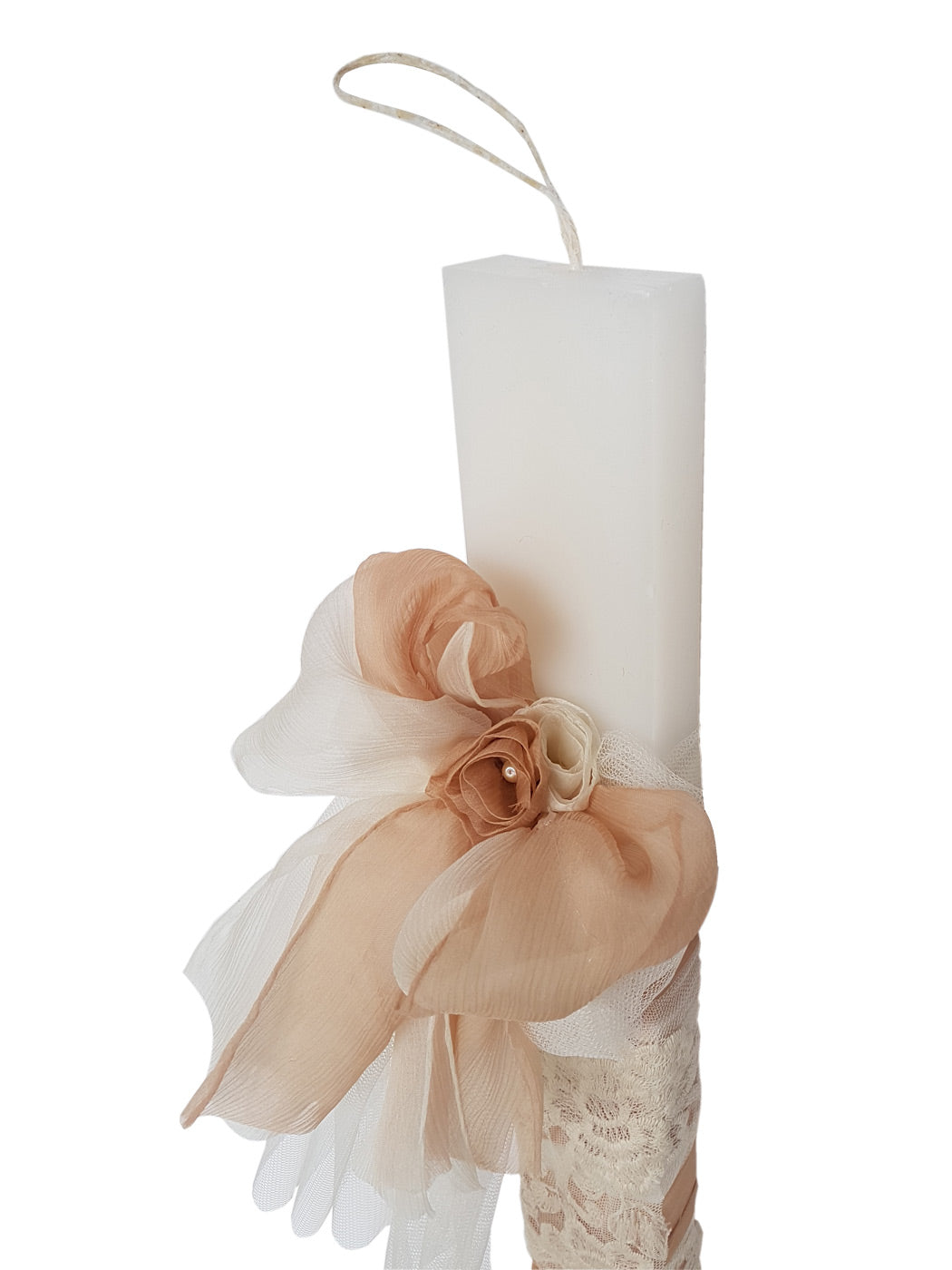 Christening candle tied with tulle, decorated with handmade flowers. It is combined with the matching baptism dress from the Designer's Cat collection as well as a range of accessories required in baptism.