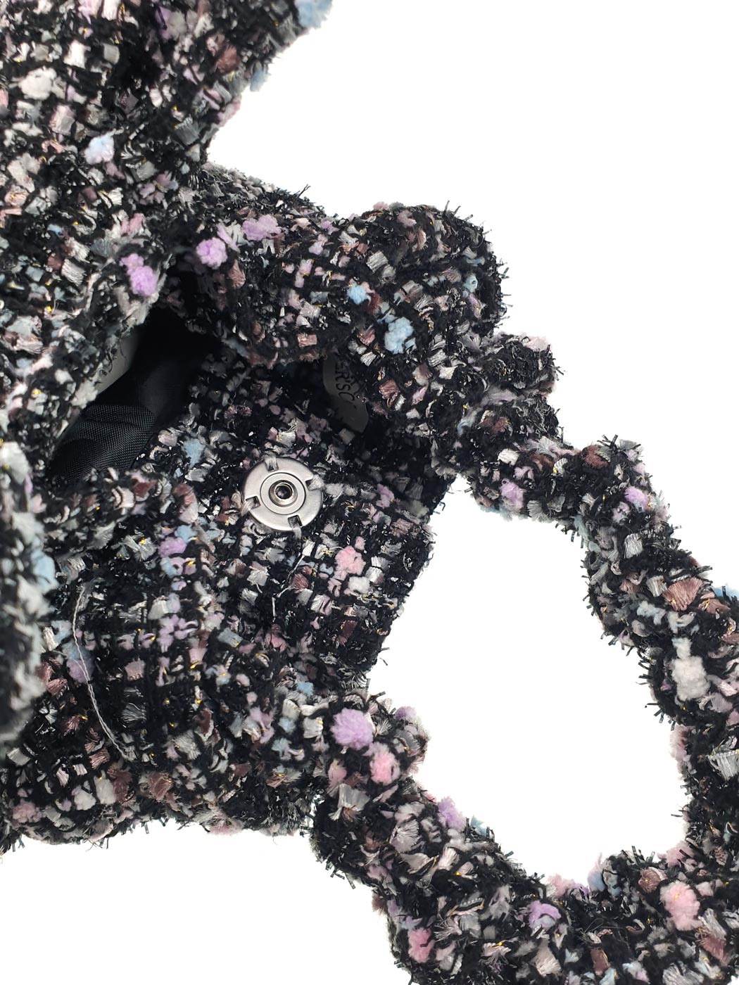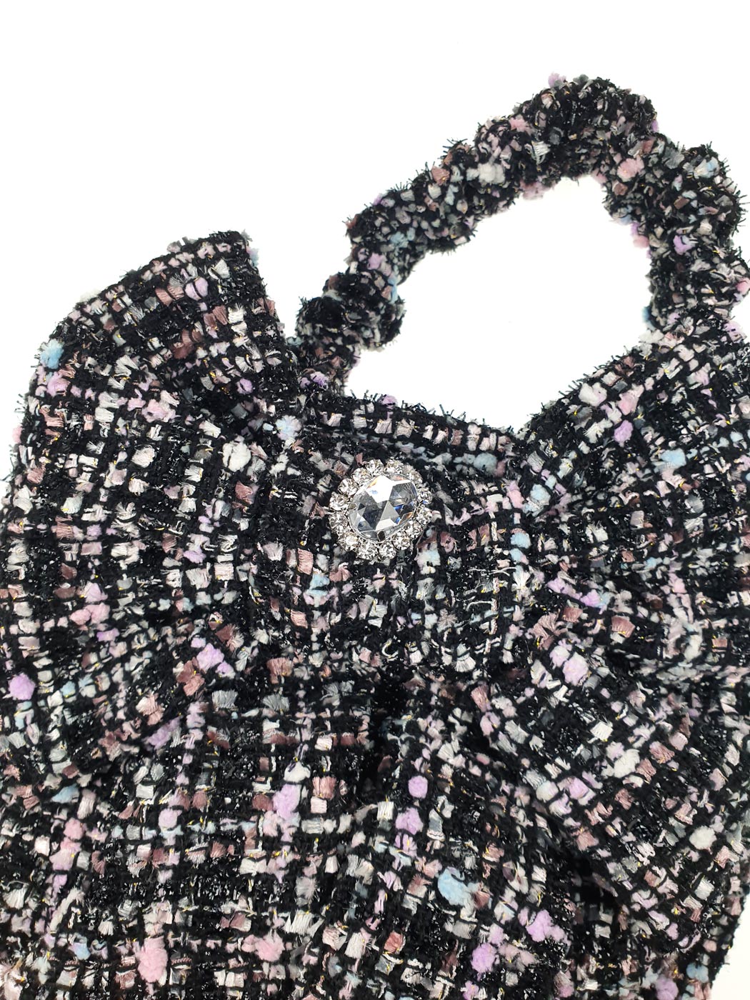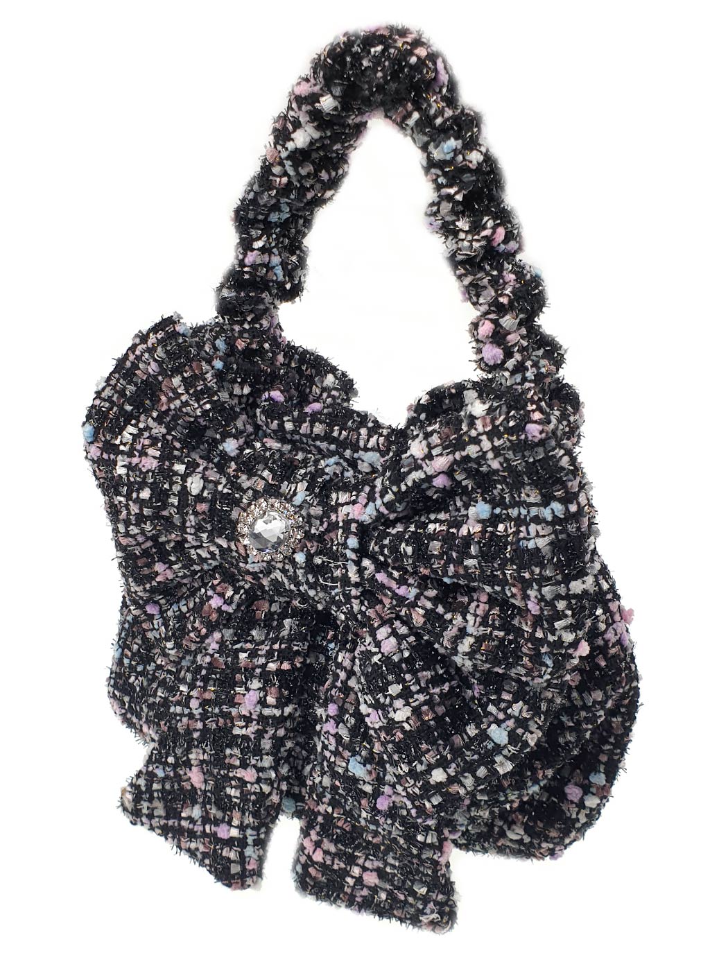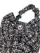 Cute soft Handbag by DESIGNER'S CAT, crafted with a classic tweed construction & Lurex yarn, with handles and metallic button closure. It is decorated with lovely bow with crystal stone. This mini bag is a practical choice that exudes the elegance.