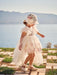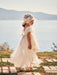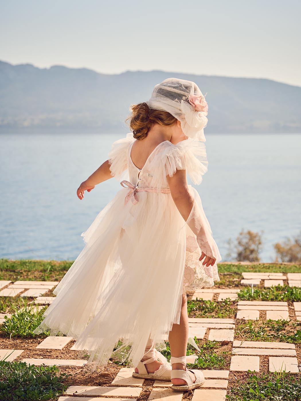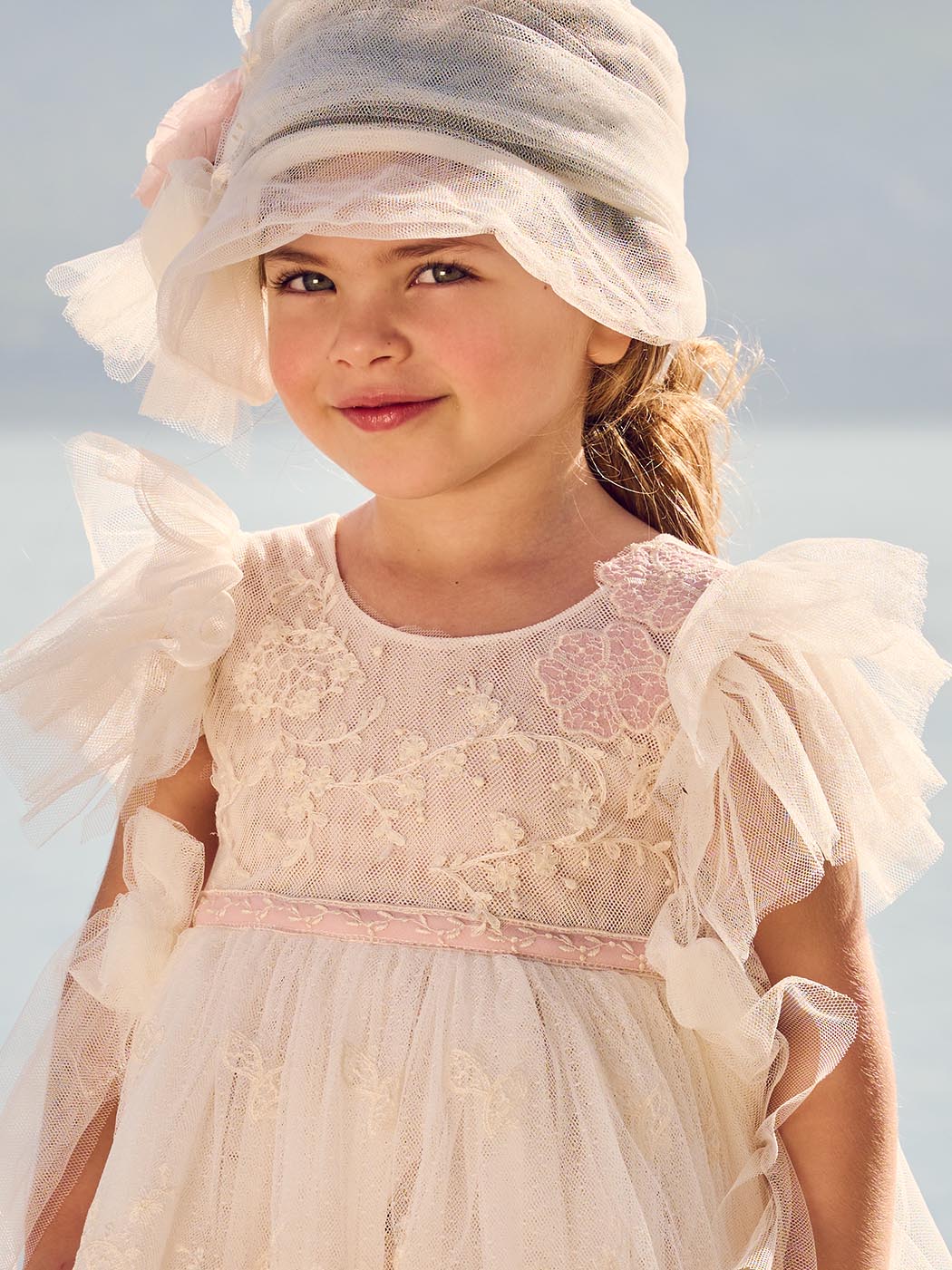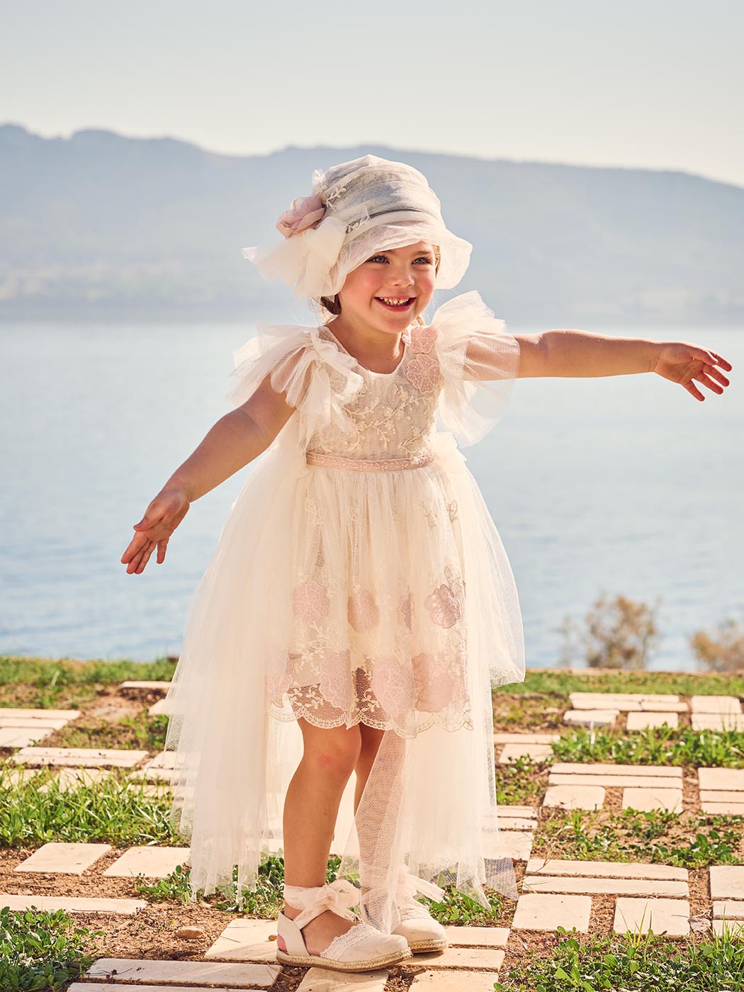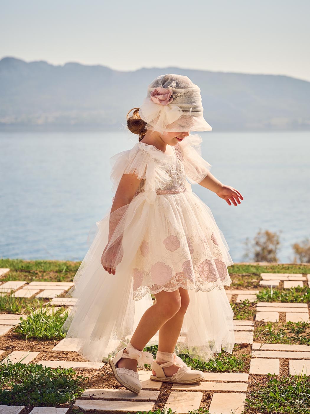 Asymmetrical dress with nice sleeves and neckline, made of wonderful tulle with French lace, decorated with embroidered motifs of flowers in a shade of dusty pink. The inner lining is 100% cotton. A dress of exceptional aesthetics for special occasions. It can be combined with a matching bolero, hair accessories and shoes from the "Designer's Cat Shoes" collection.