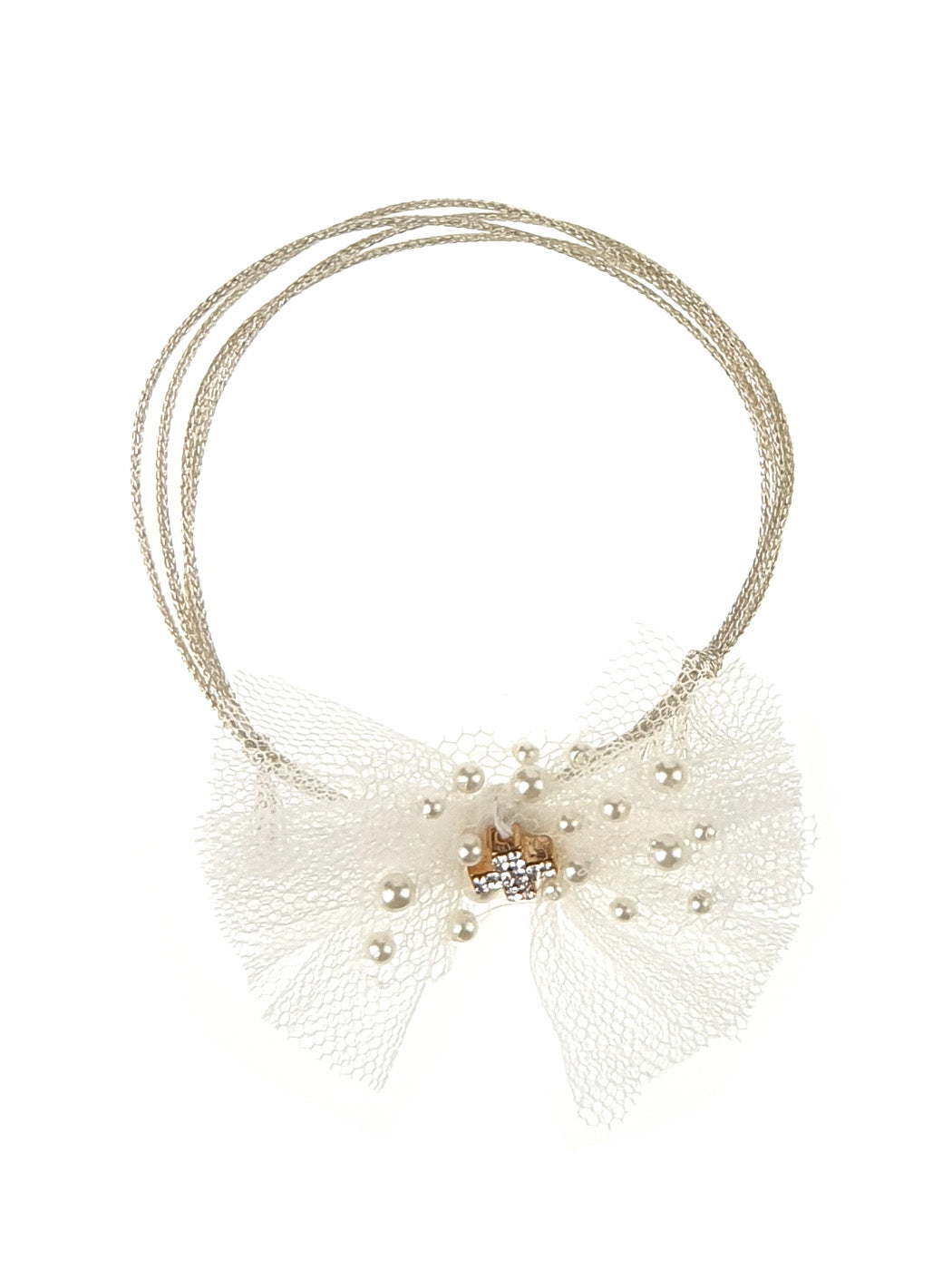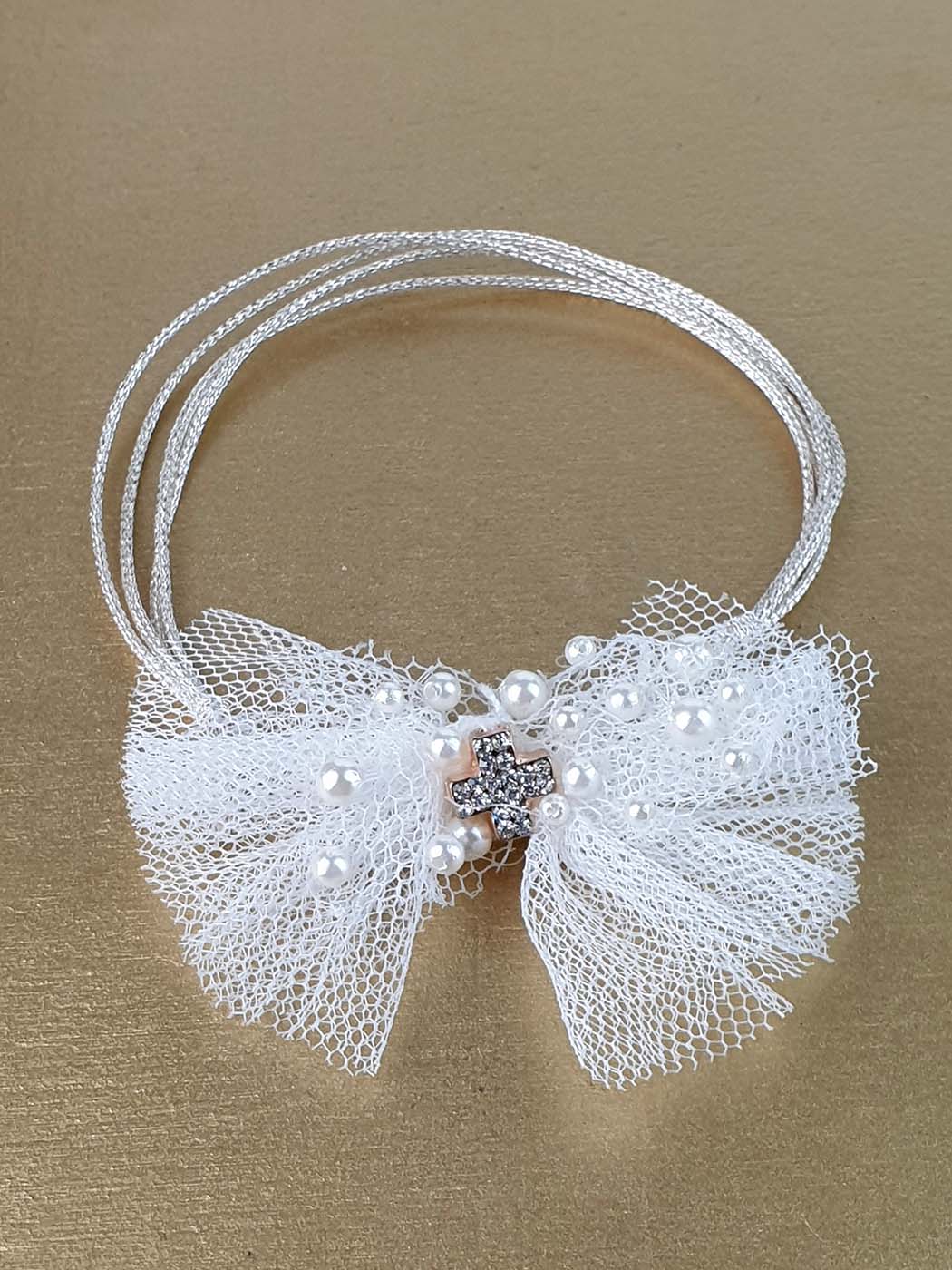 Handmade testimonial (Martyriko) bracelet DESIGNER'S CAT, with beautiful cross of strass, decorated with an impressive embroidered tulle bow with pearls.