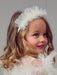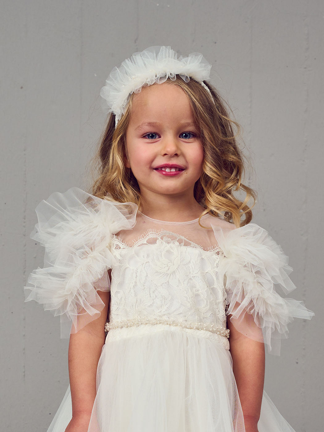 Hair ribbon with tulle ruffles decorated with pearls , for ceremonies and special events. It is available in one size. The headband Ribbon is elastic and it corresponds to ages from 2 to 10 years old. For online shopping by the official website "designerscat.com" the product comes in gift box.