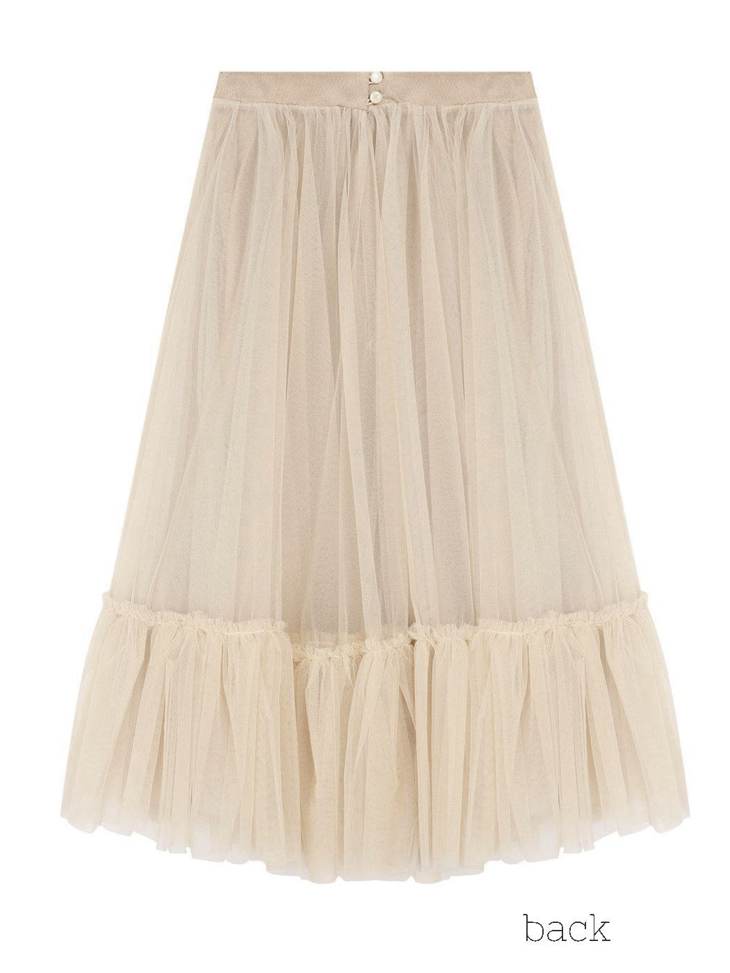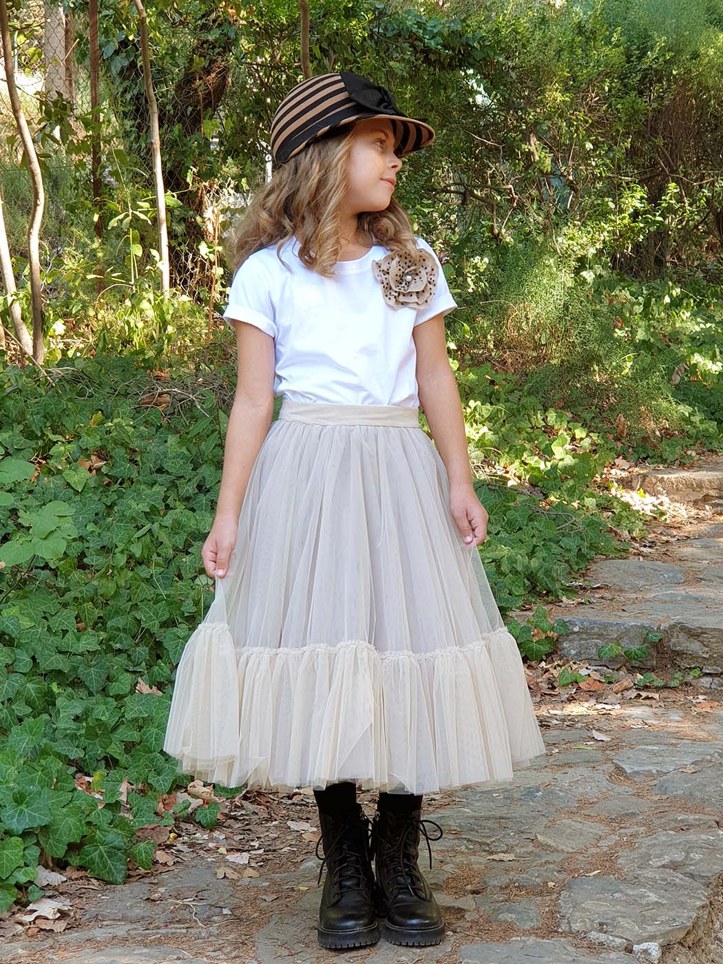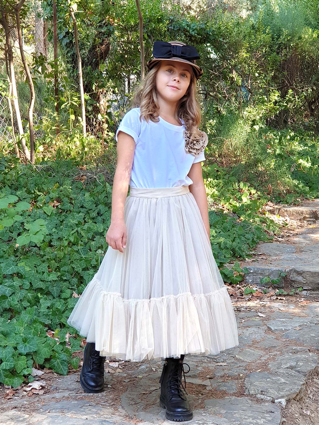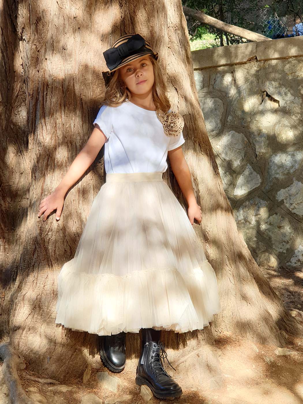 Elegant max skirt, made of fine tulle with "waves”in sweet beige color. Inner lining is 100% cotton. Celfie skirt can be combined with matching jacket, hair accessories and shoes from the "Designer’s Cat Shoes" collection. Available sizes: 2 to 12years old. Color: beige.