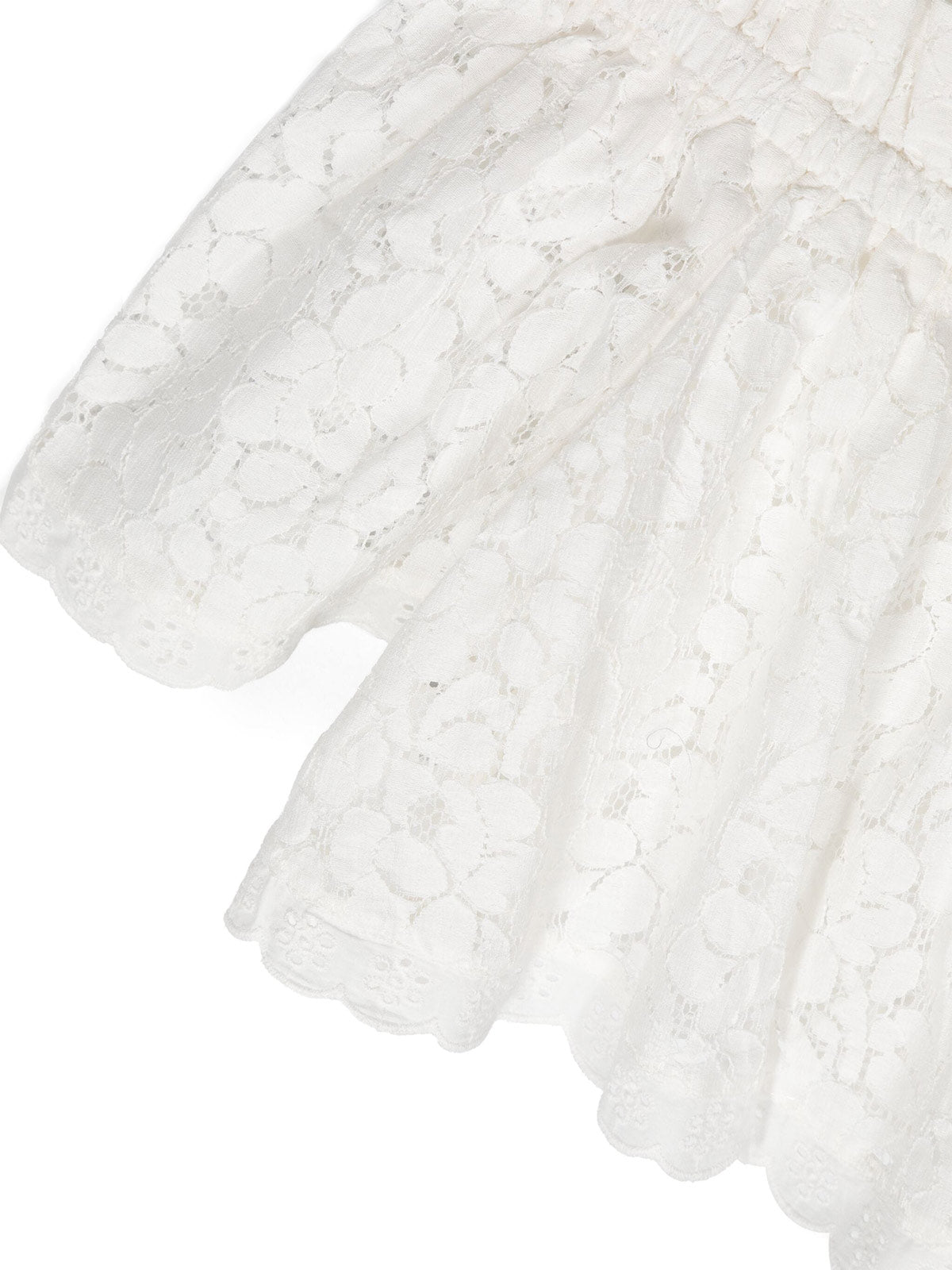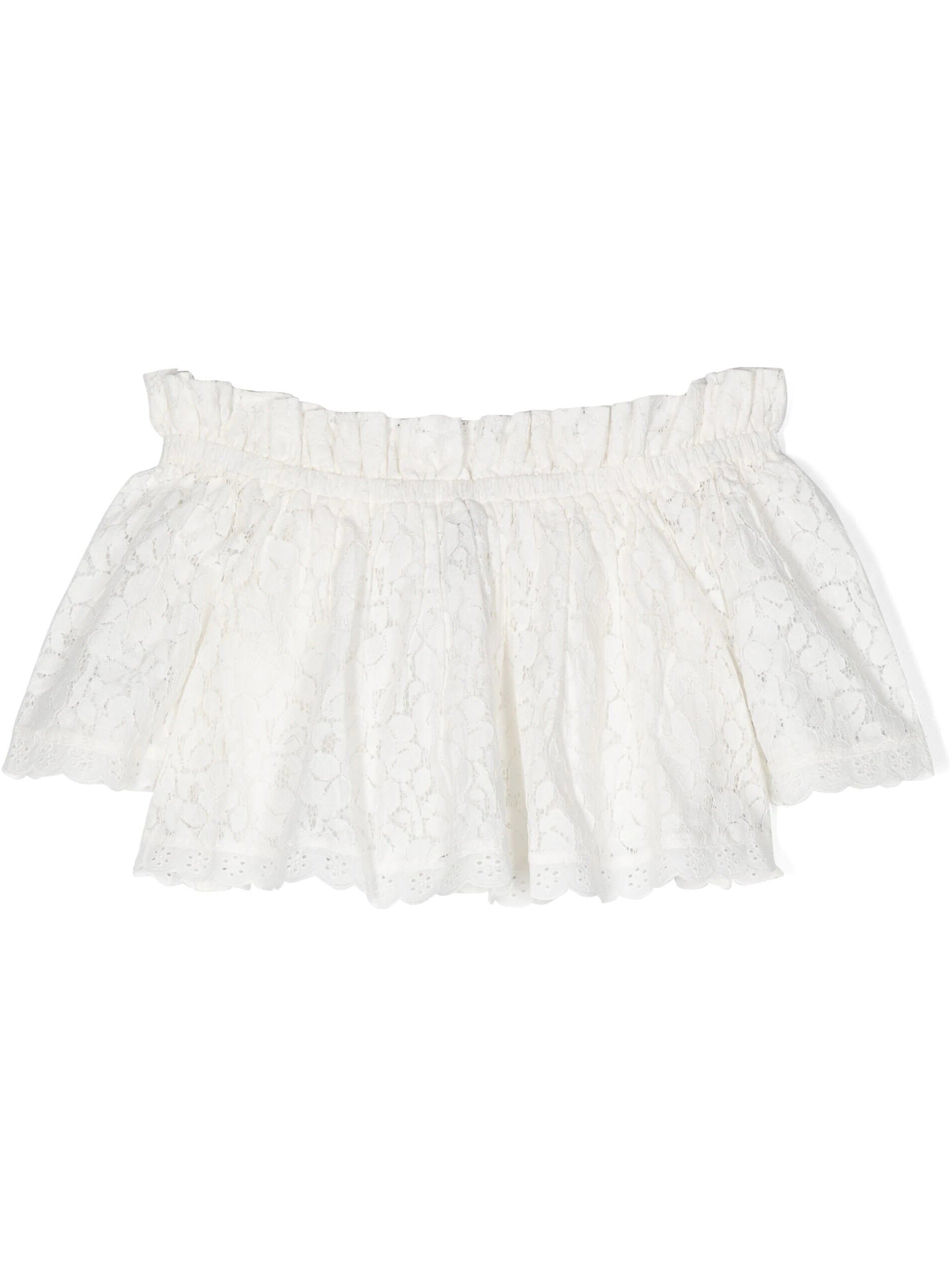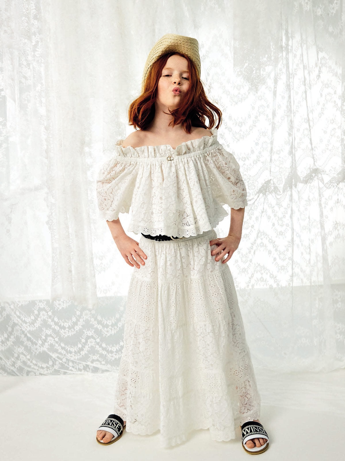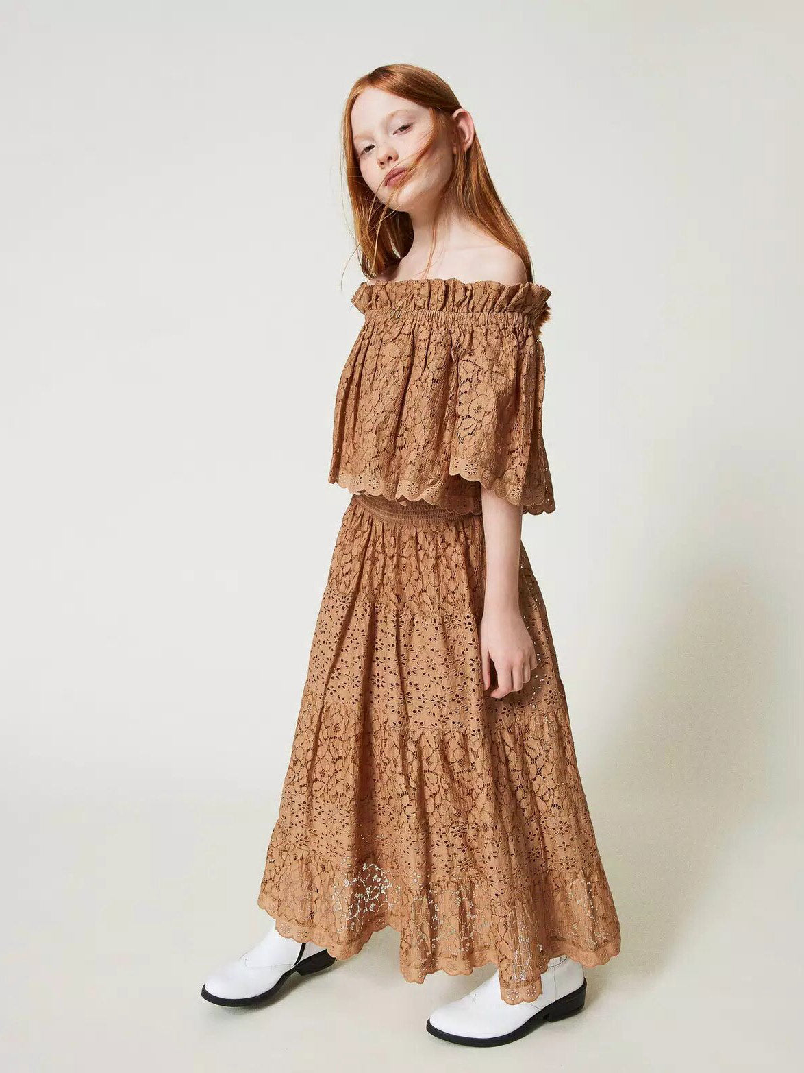 Girls’ romantic off-shoulder lace blouse with three-quarter raglan sleeves, elasticated neckline and logo plate. A perfect choice for a special occasion. It can be combined with a matching skirt or jeans pants.