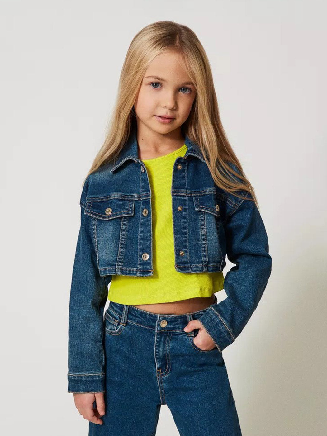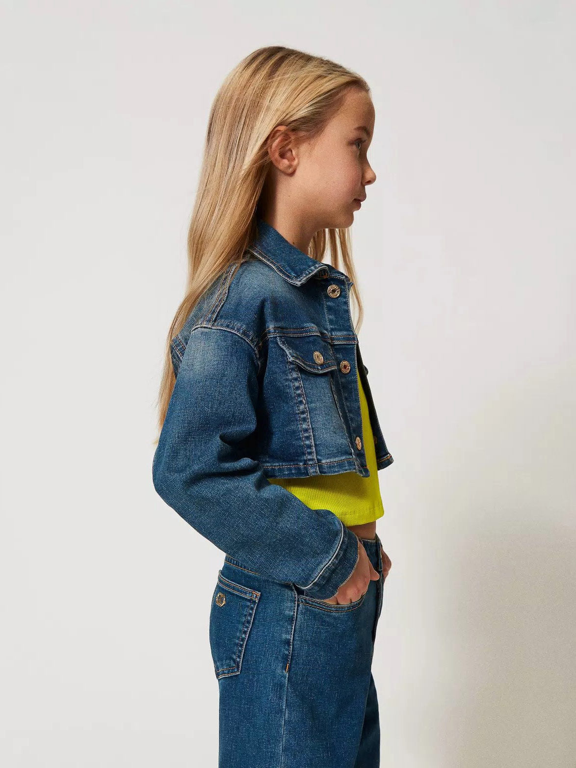 Cropped jacket for girls made of stretch denim with metal logo button fastening, flap pockets and straight fit.