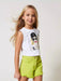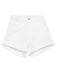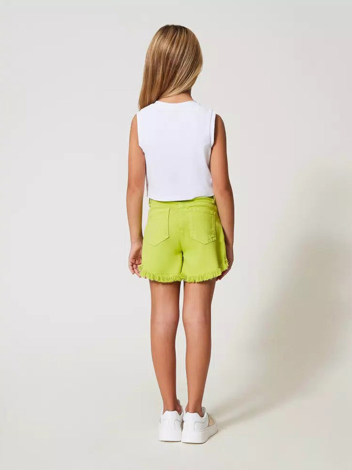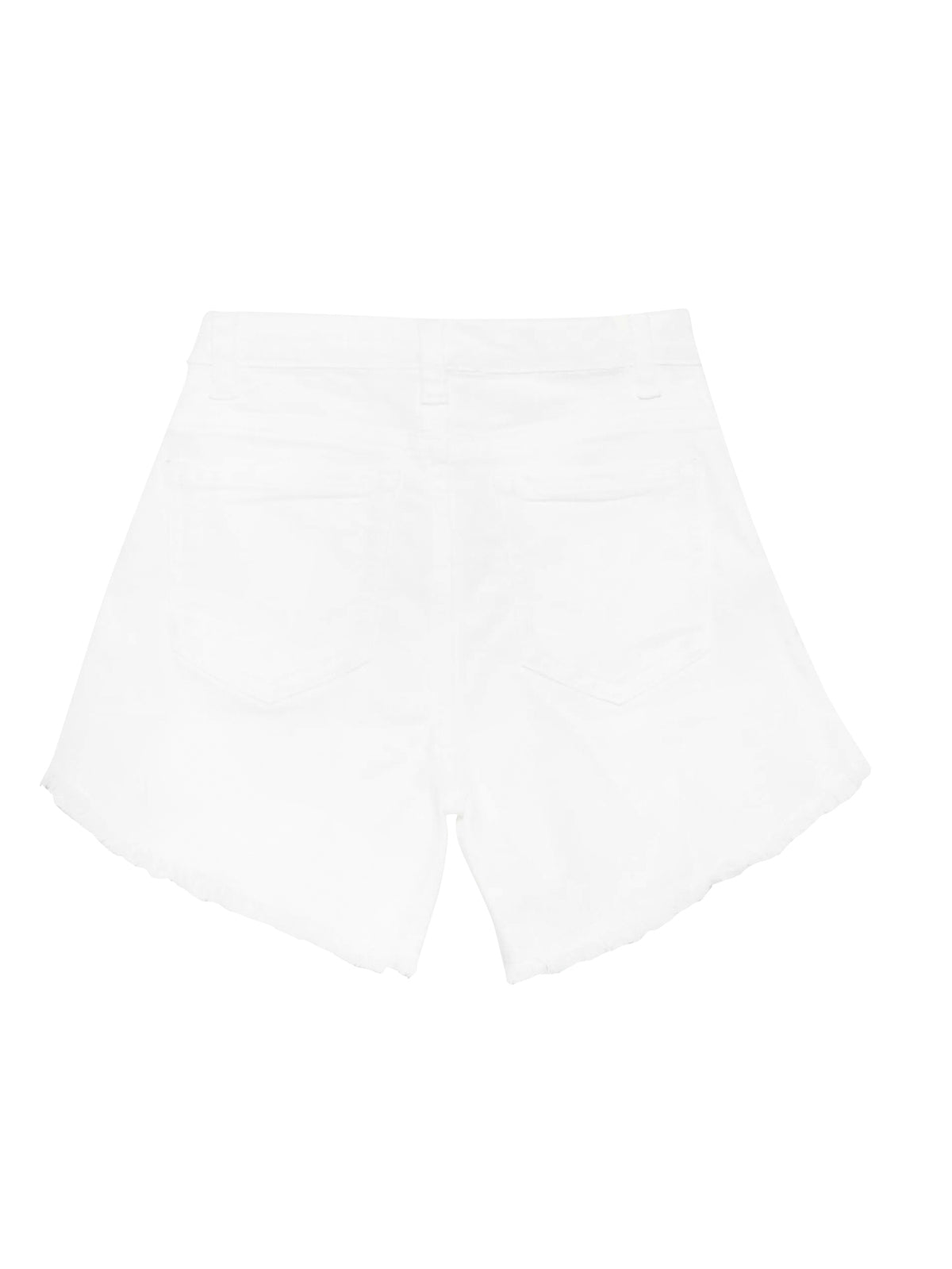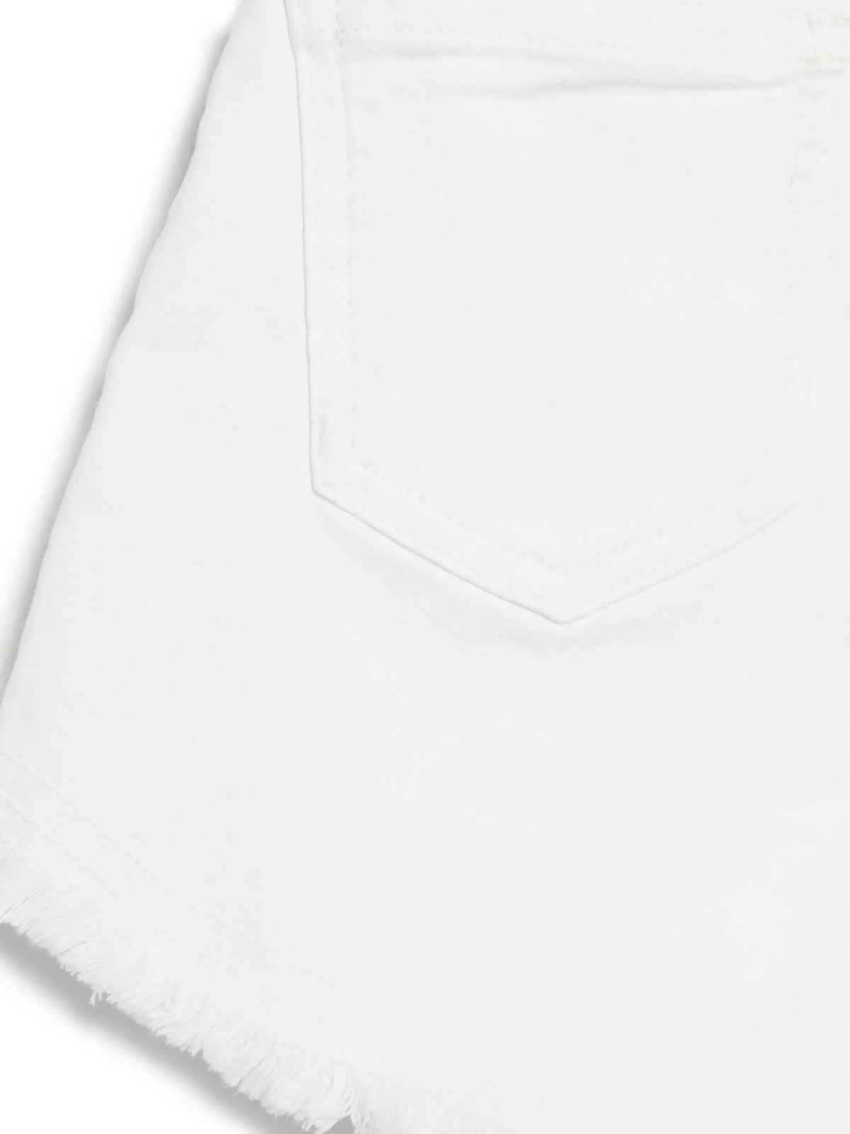 Girls' frayed "bull" denim shorts with zip and button fastening, five pockets, logo plate and fringed hem, straight fit.
