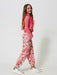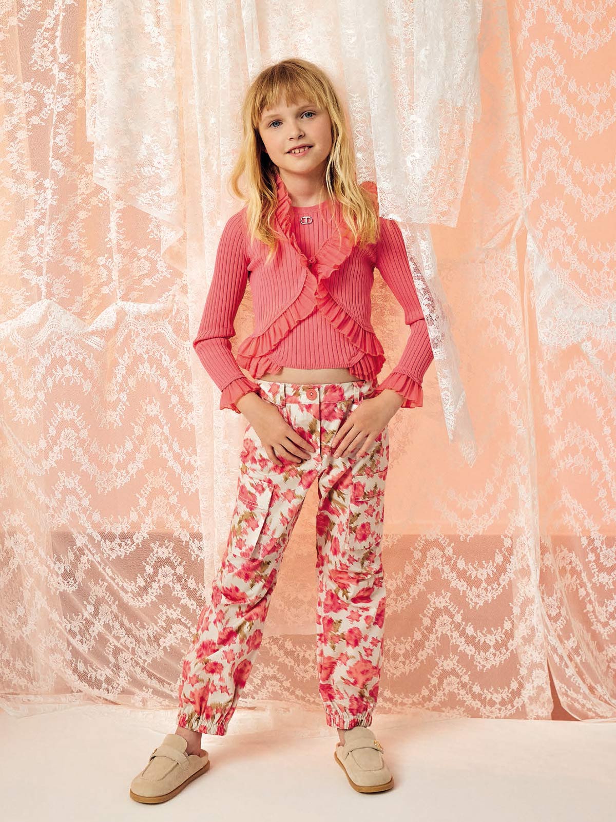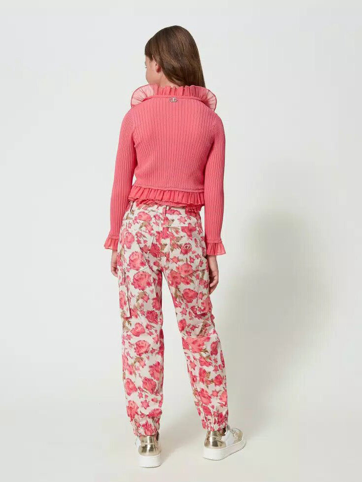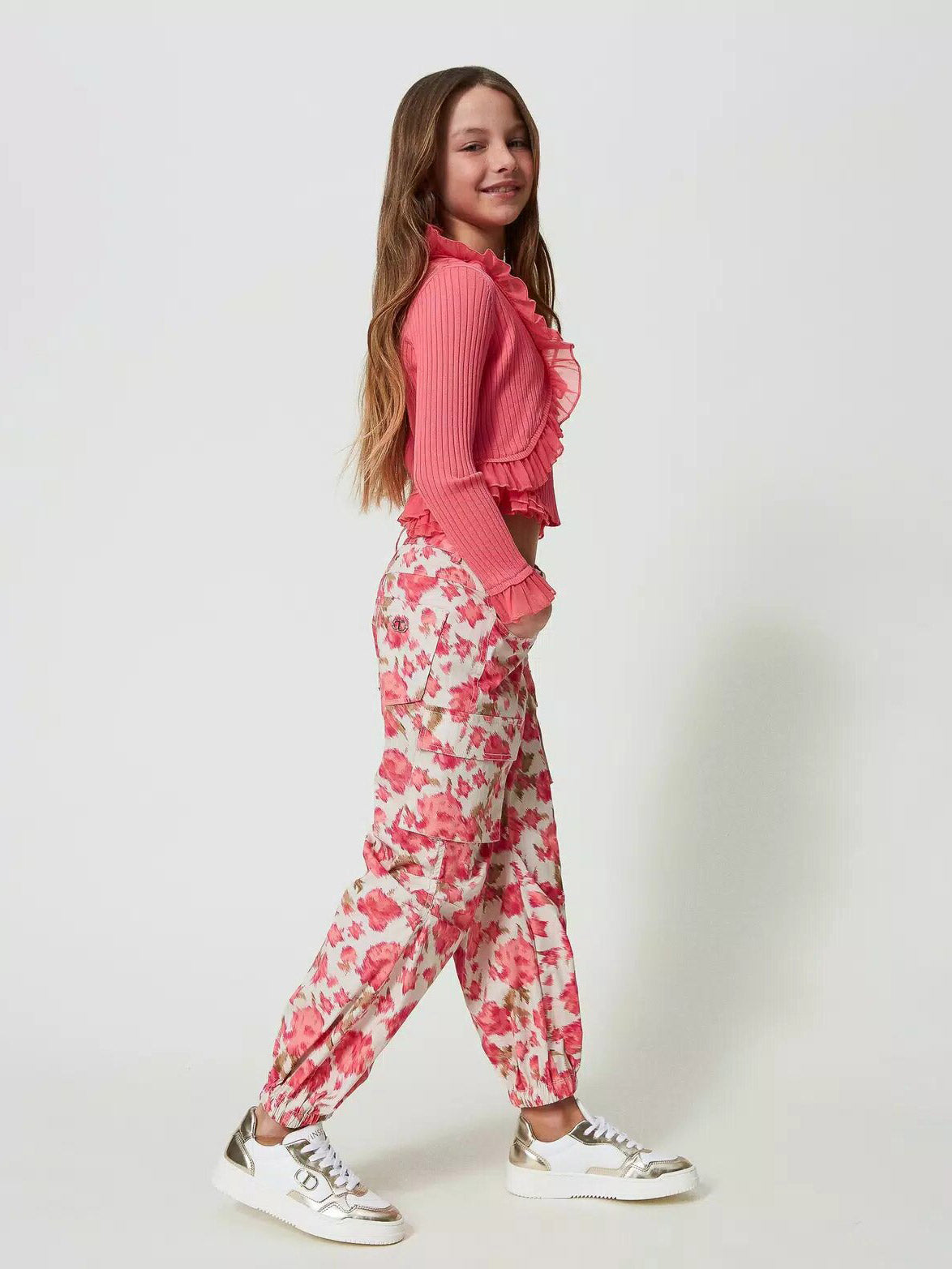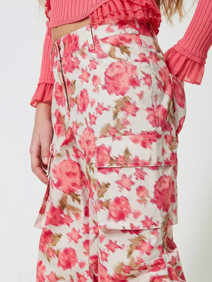 Urban style cargo trousers with floral print, made of stretch poplin, elasticated hem, zip and button closure and side bellow pockets. It's very comfortable practical and soft.