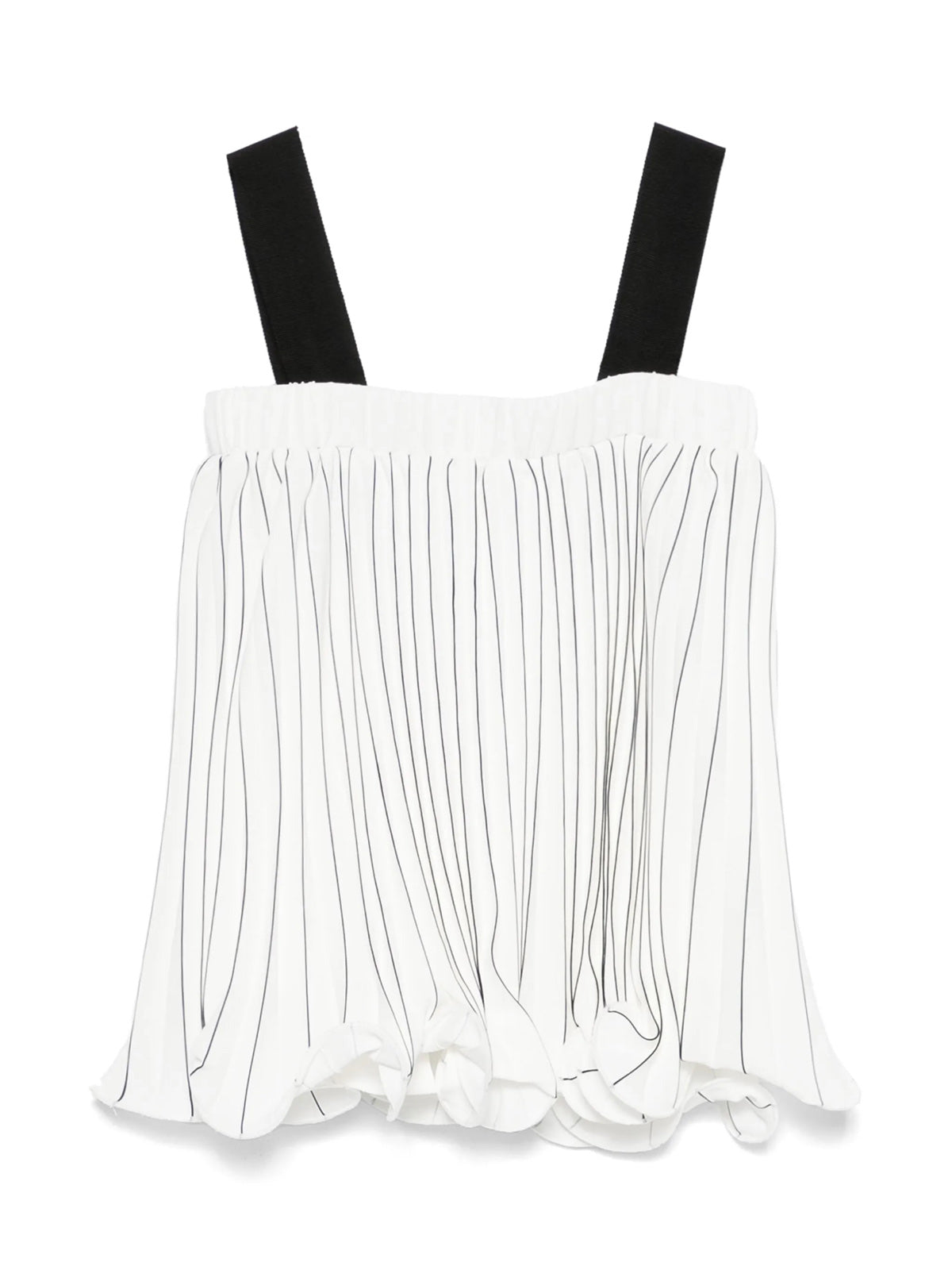 A lovely short pleated skirt with contrasting striped print. It can also be worn as a top. Add shoulder straps via snap button and it turns into a modern, sophisticated blouse.