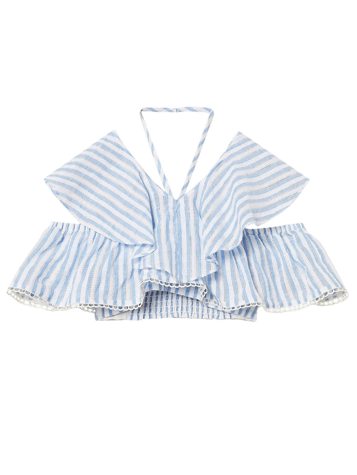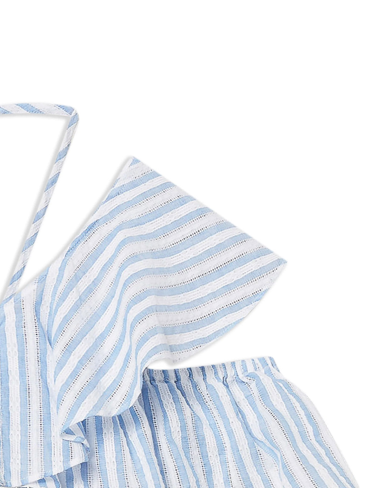Girls' cropped top made from striped jacquard cotton muslin, with cap sleeves, V-neck, neck strap, side zip fastening, in loose fit.