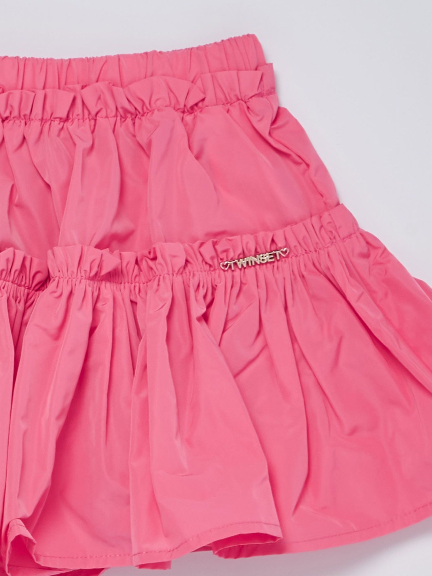 A cute circle taffeta skirt with ruffles at the bottom, elastic waistband and logo. Twinset skirt can be combined with sweater or t-shirt, completely changing the girl's style.