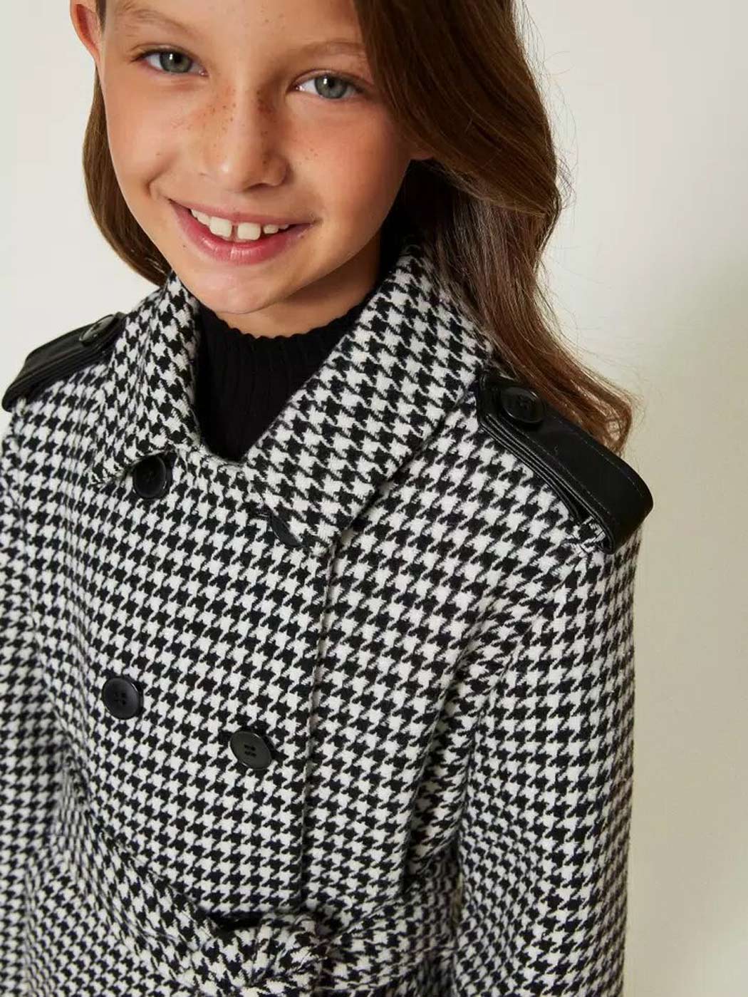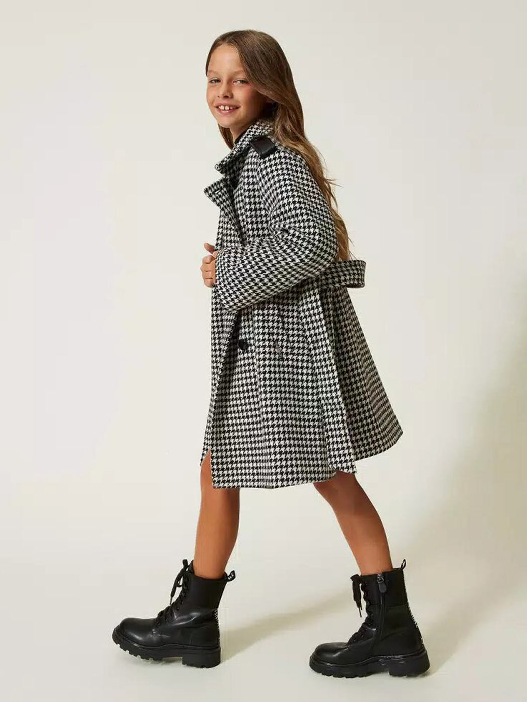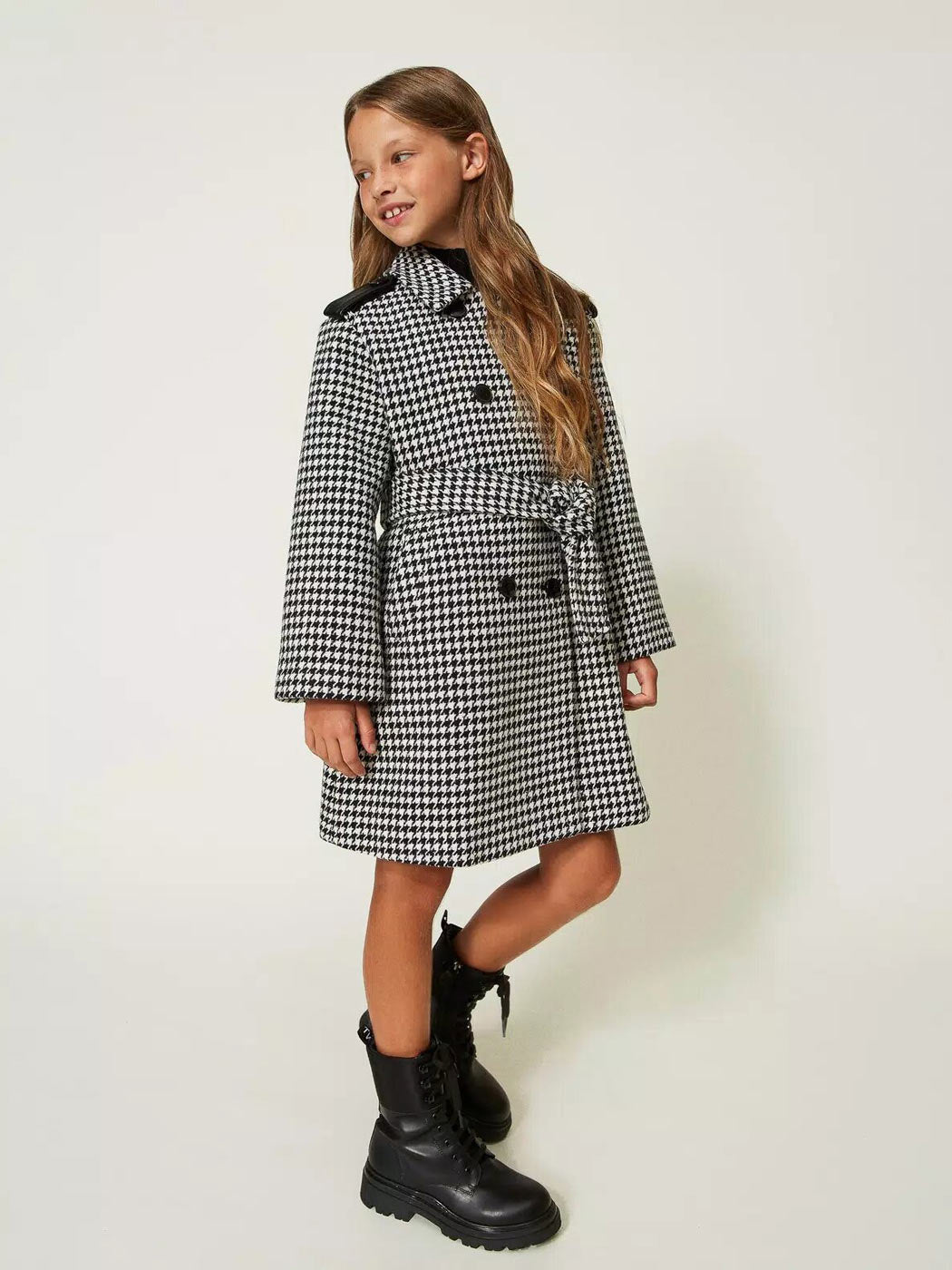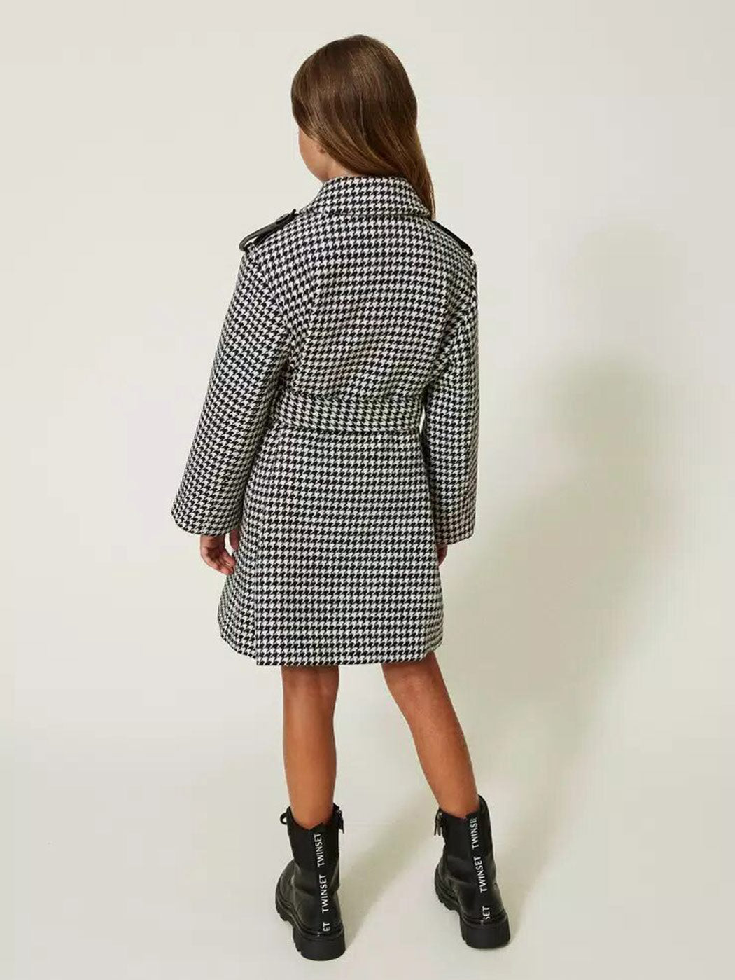 A classic wool cloth coat with Houndstooth pattern, double-breasted closure, frog fasteners on the shoulders, front pocket, inner lining, removable belt. Perfect for everyday and special occasions.