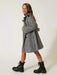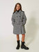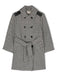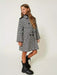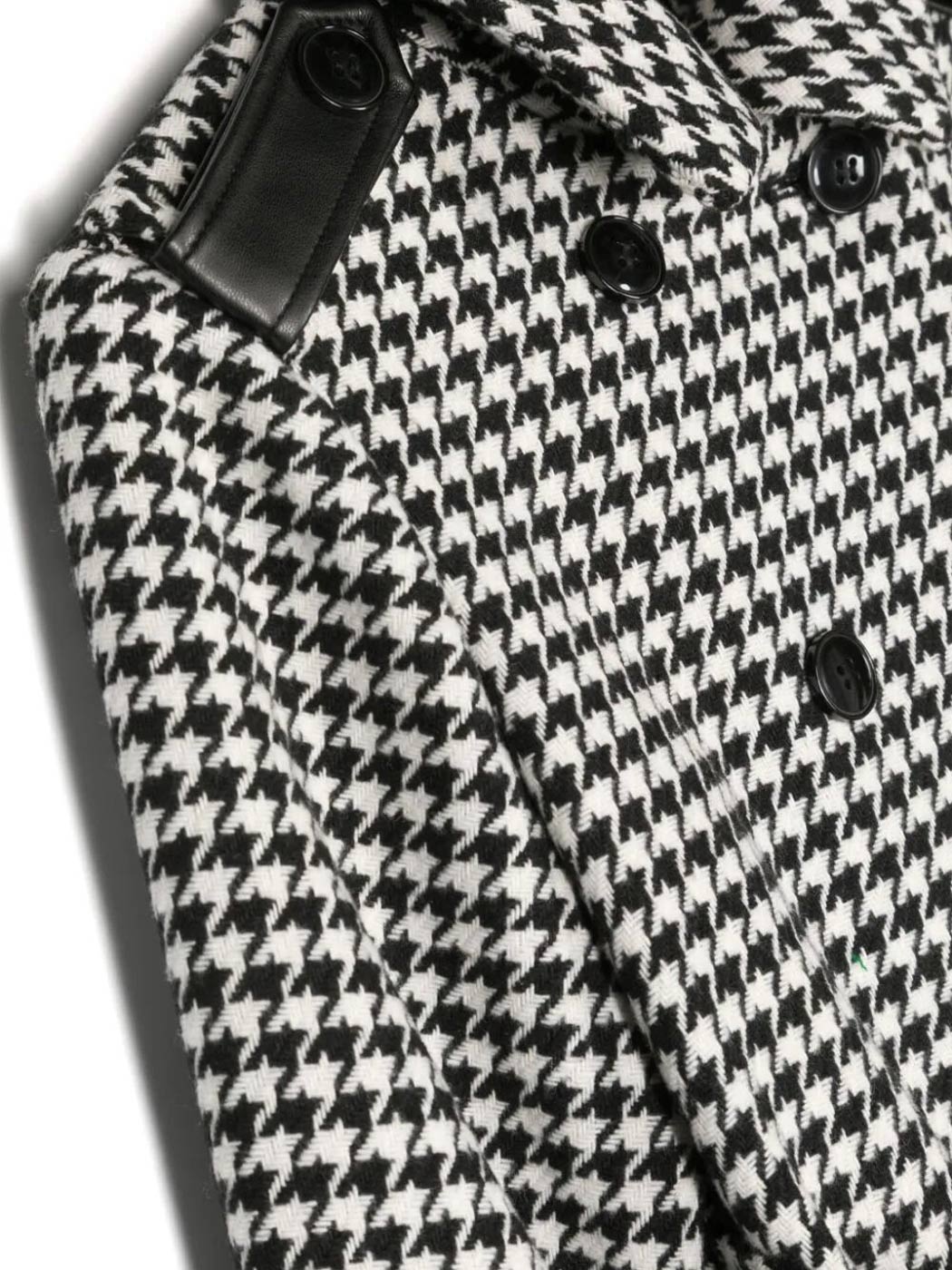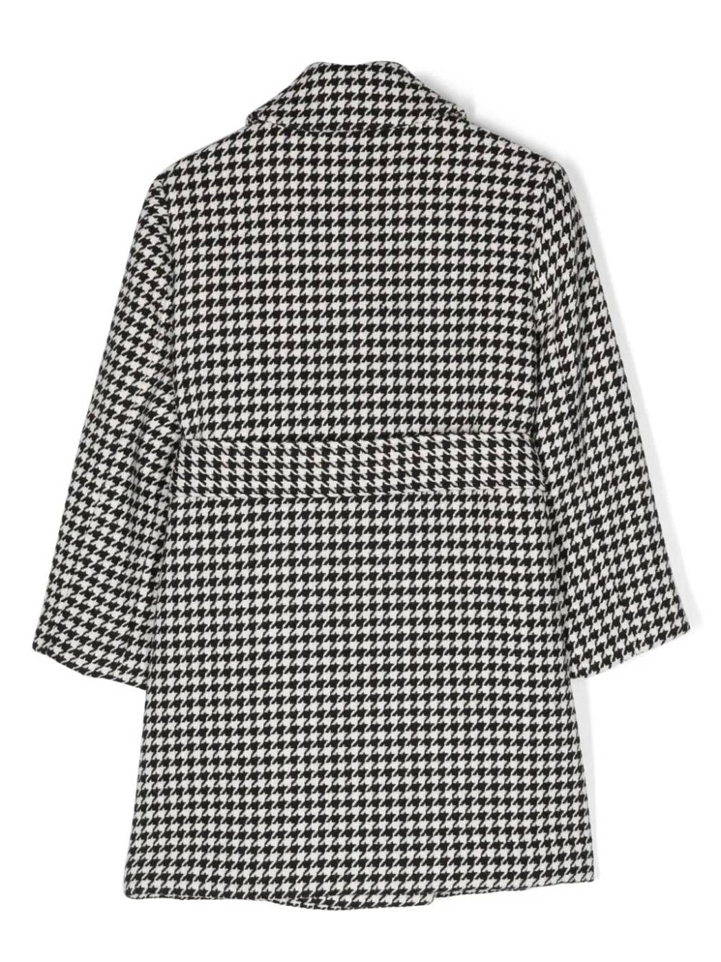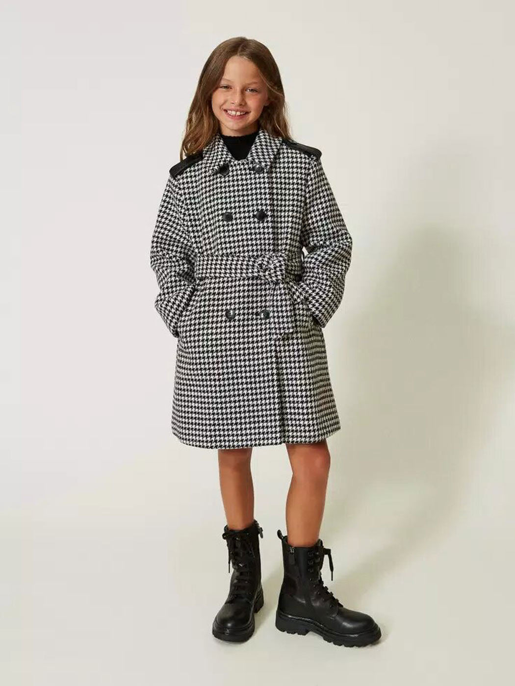 A classic wool cloth coat with Houndstooth pattern, double-breasted closure, frog fasteners on the shoulders, front pocket, inner lining, removable belt. Perfect for everyday and special occasions.