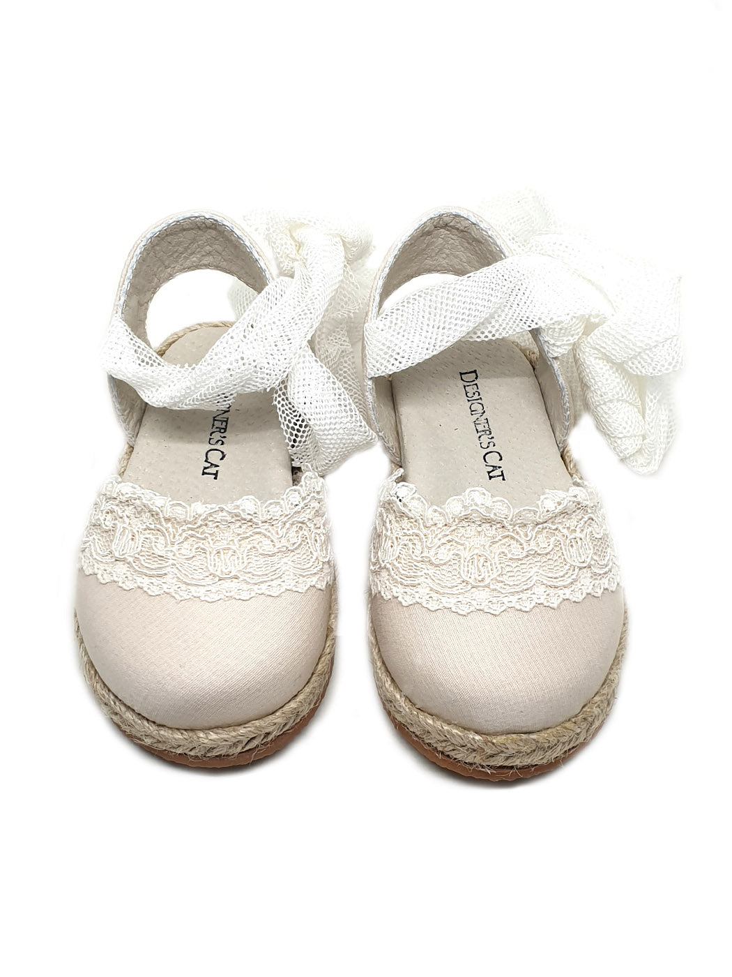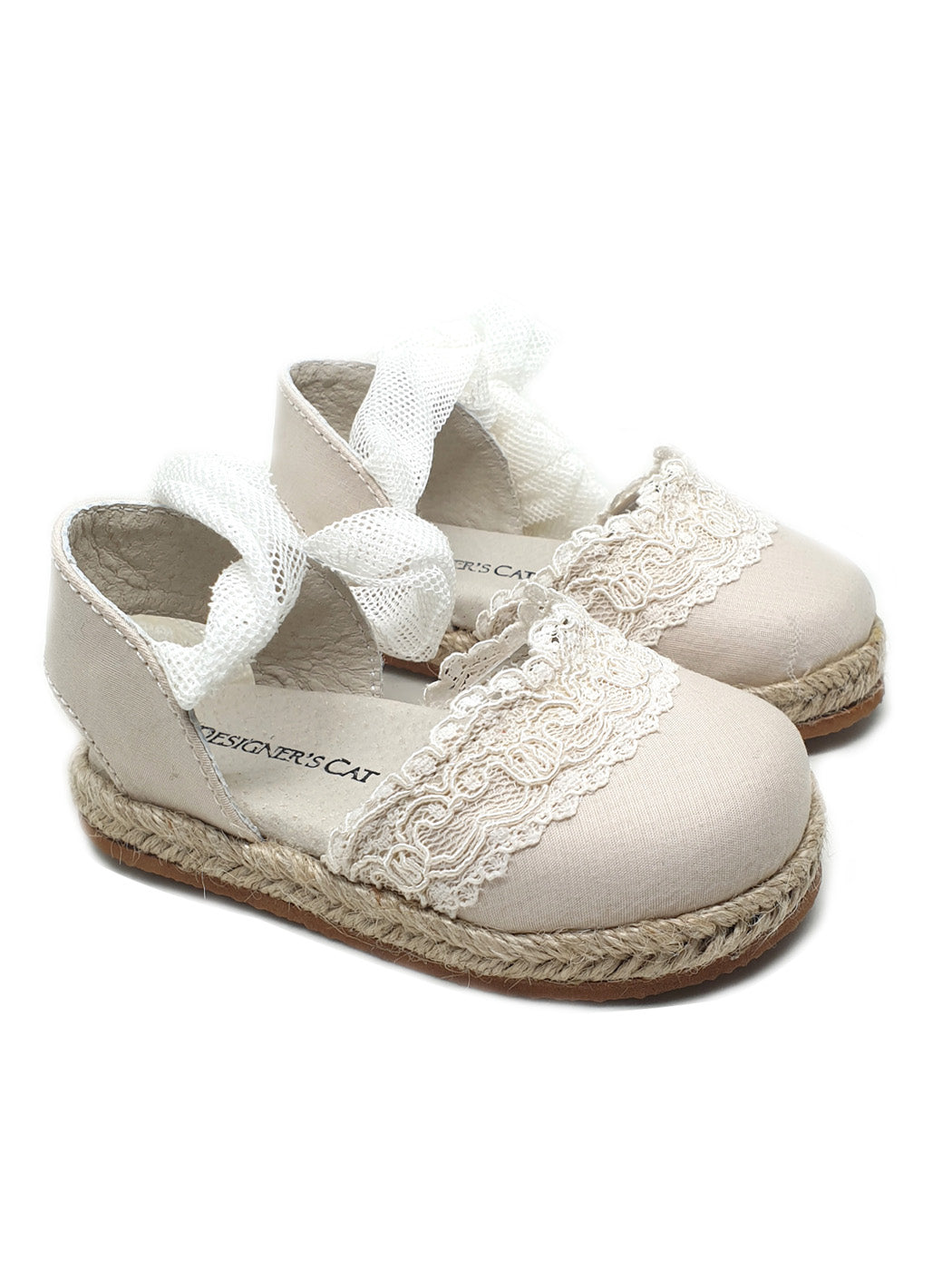 Modern espadrille-type shoes of excellent quality, with a leather insole that follows the foot's anatomy and is enriched with ARNEFLEX BREATHABLE foamy antibacterial material. The external fabric is special cotton- lace and the inner lining is 100% leather in order to allow the foot to breathe. They have a non-slip sole to ensure steady walking and extra heel support to secure the best position to the foot. Available sizes: 18-25. All DESIGNER'S CAT shoes are designed and manufactured in Greece. They match with the collection's outfits for girls, as well as with the baptism and casual accessories.