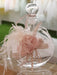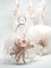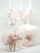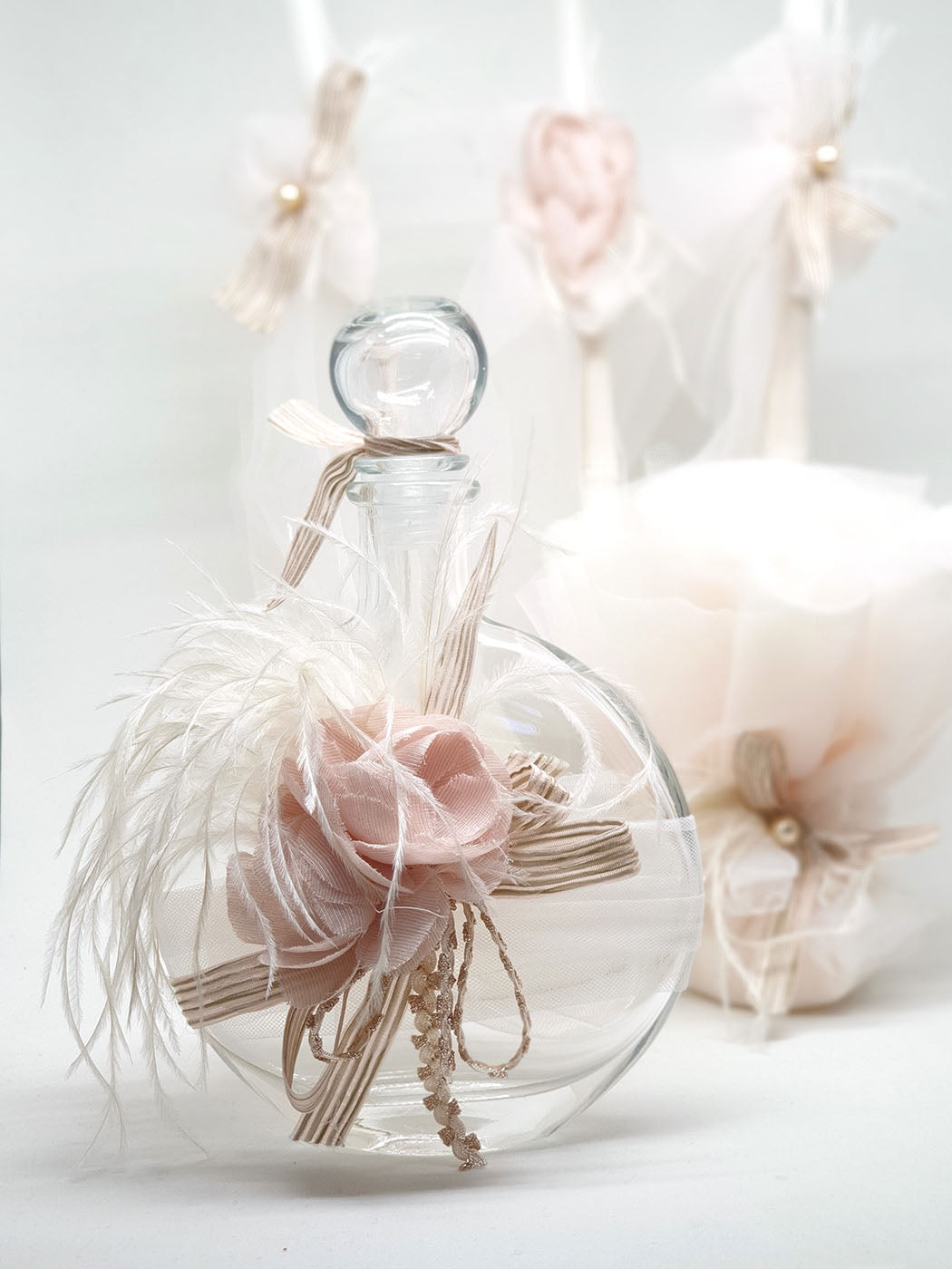 Baptism oil set 5 pieces (1 oil bottle, 3 candles and 1 scented soap bar), decorated with lovely handmade flowers in dusty pink vintage color. It is combined with the matching baptism dress from the Designer's Cat collection.