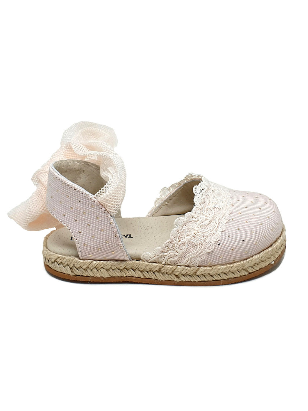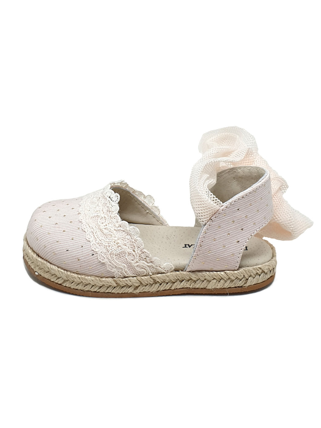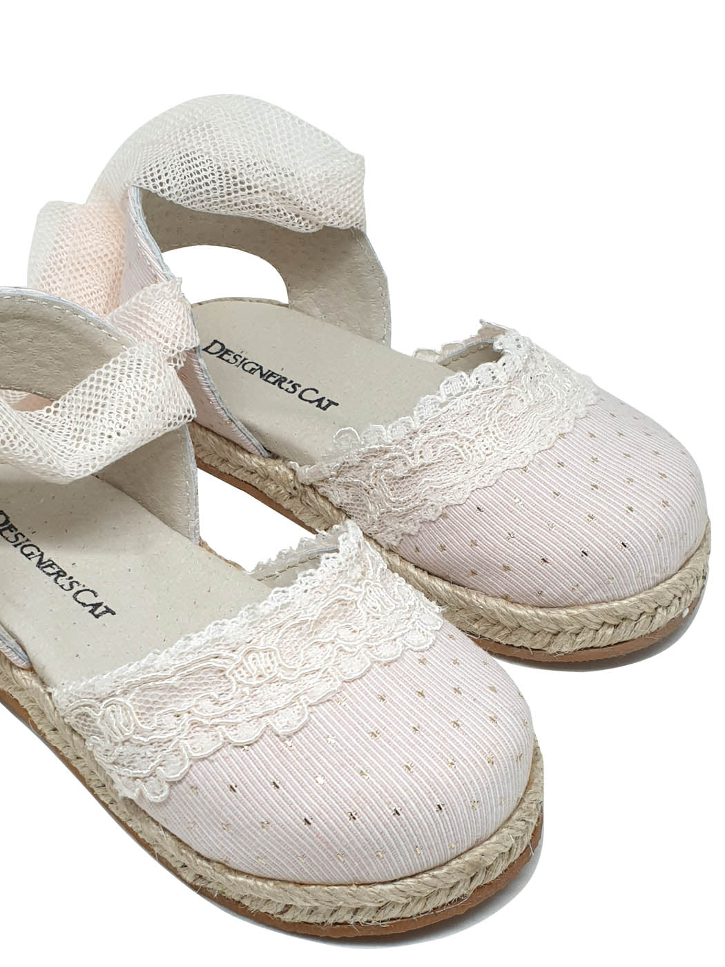 Modern espadrille-type shoes of excellent quality, with a leather insole that follows the foot's anatomy and is enriched with ARNEFLEX BREATHABLE foamy antibacterial material. The external fabric is special cotton- lace and the inner lining is 100% leather in order to allow the foot to breathe. They have a non-slip sole to ensure steady walking and extra heel support to secure the best position to the foot. Available sizes: 18-25. All DESIGNER'S CAT shoes are designed and manufactured in Greece. They match with the collection's outfits for girls, as well as with the baptism and casual accessories.
